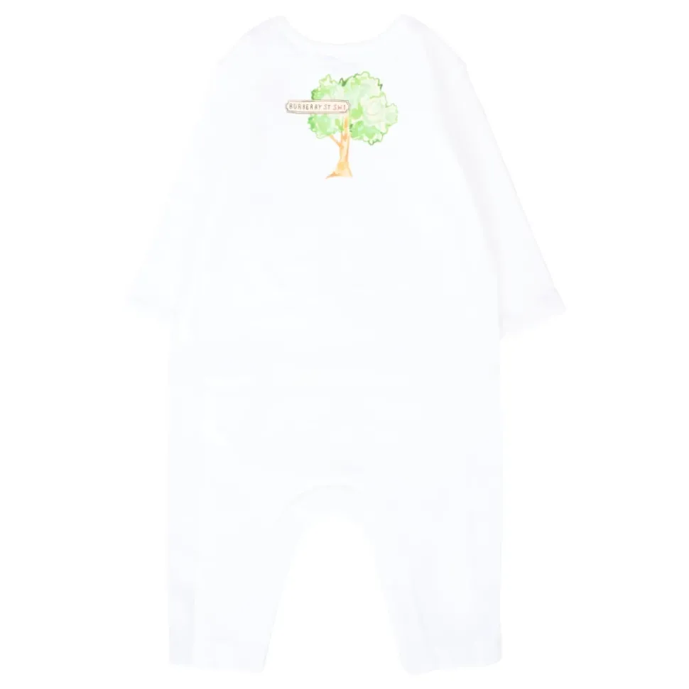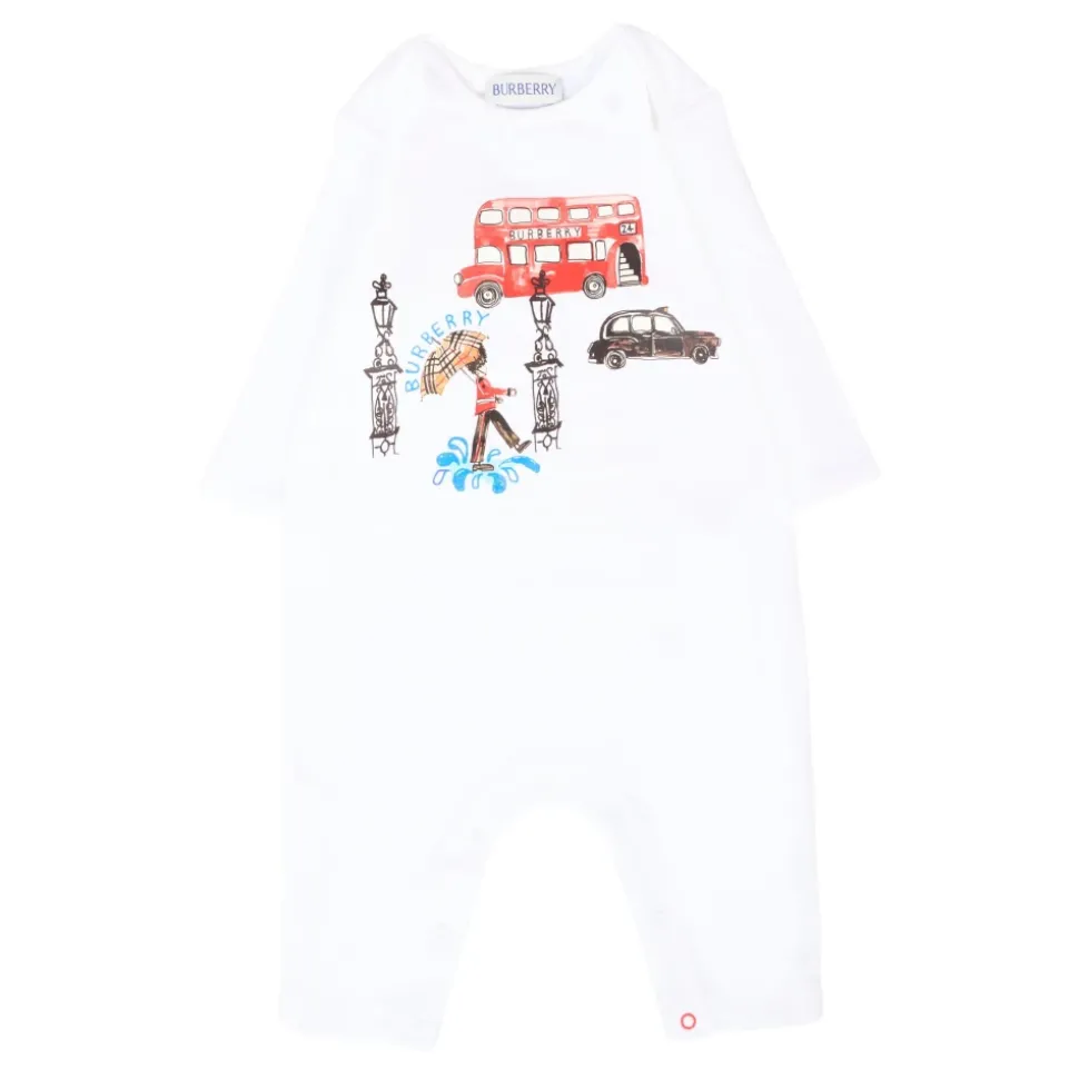 Kleed je kleintje in stijl met deze witte katoenen romper van Burberry. Met lange mouwen, een geribbelde ronde hals en drukknoopsluiting tussen de benen, is deze romper versierd met een charmante rode bus- en paraplu-print geïnspireerd op Engeland. Gemaakt van 70% katoen, 96% katoen, 4% elastaan. Machinewas op 30°C.