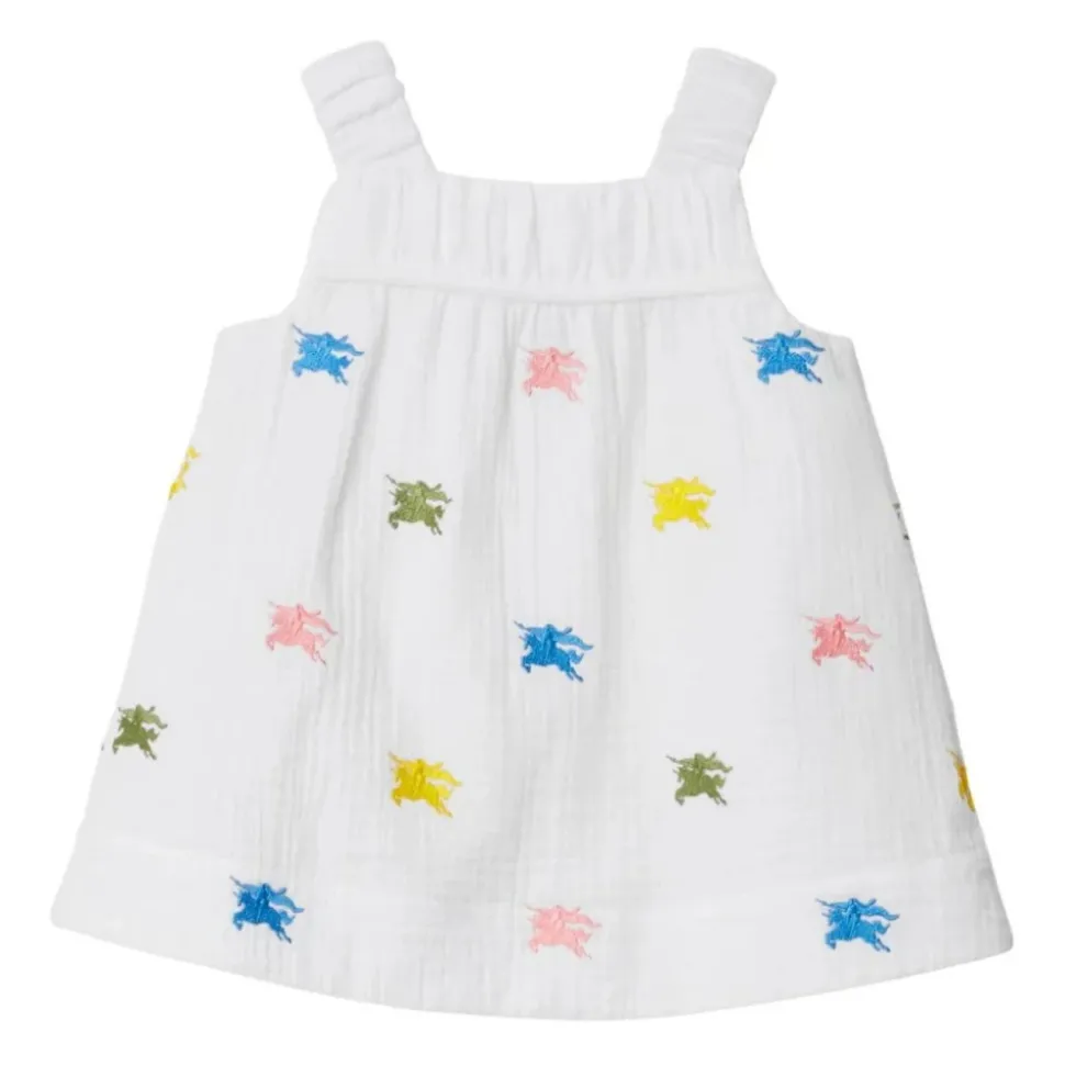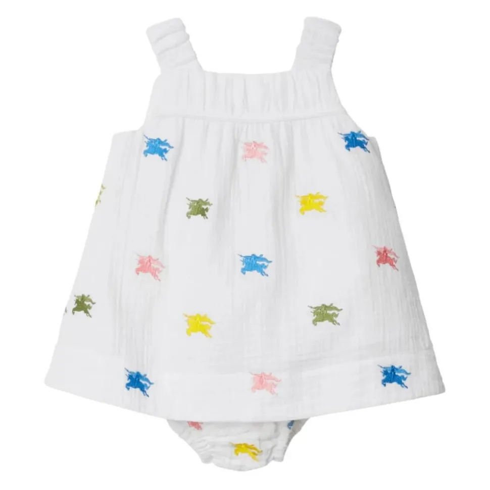 Kleed je kleintje in Burberry`s Equestrian Kids Witte Jurk Set, met het iconische ruiter motief. Deze charmante set bestaat uit een mouwloze witte katoenen jurk met een vierkante hals en rechte zoom, gecombineerd met bijpassende bloomers voor een complete look. Belangrijkste kenmerken: Wit | Katoen | Vierkante hals | Mouwloos design | Rechte zoom | Equestrian knight motief | Afmetingen en pasvorm: Regular fit | Samenstelling en onderhoud: 100% Katoen | Machinewas koud, droogtrommel laag.