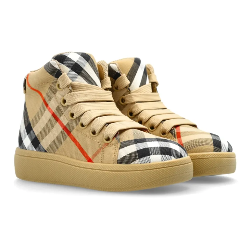 GERUITE SCHOENEN van Burberry Kids zijn een voortreffelijke keuze voor de jongste mode-enthousiastelingen, geïnspireerd door de Britse stijl. De hoge sneaker-silhouet en de comfortabele, brede neusbox combineren gemak met klassieke elegantie, waarbij de tijdloze karakter van dit schoeisel wordt benadrukt. Het dominante ruitpatroon op een beige achtergrond, verrijkt met veelkleurige strepen en subtiele rode accenten, geeft het hele ontwerp een onderscheidende individualiteit. De zorgvuldig geselecteerde buitenstof, versterkt met zachte leren afwerkingen, garandeert duurzaamheid en draagcomfort. De flexibele rubberen zool zorgt ervoor dat elke stap licht en veilig is. Deze schoenen belichamen de luxueuze esthetiek en meesterlijk vakmanschap van Burberry en blijven een symbool van uitzonderlijke smaak, zelfs in kindercollecties. WAAROM ZOU U DIT PRODUCT KOPEN? * Iconisch ruitpatroon geïnspireerd door de Burberry-traditie * materialen en nauwgezette afwerking * Hoog draagcomfort zelfs tijdens dagelijkse activiteiten * Tijdloze stijl die de normen van luxe kindermode weerspiegelt Zoolhoogte: 3cm Zoolhoogte op het hoogste punt: 4cm