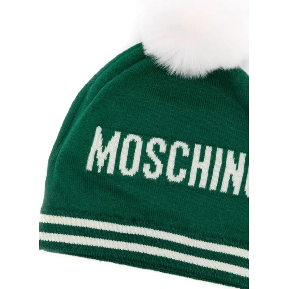 Moschino gebreide muts met pompon en Teddy-logo is een zacht gebreid accessoire met een Teddy-motief aan de voorkant en een speelse pompon. Ideaal voor dagelijkse warmte en casual outfits. Belangrijkste kenmerken: Groen | Verde | Katoen | Effen gebreid | Pompon bovenop | Teddy-logo aan de voorkant | Afmetingen & pasvorm: Omtrek: 42 cm | Labelmaat: II | Geschikt voor een hoofdomtrek van 42 cm | Samenstelling & verzorging: 85% Katoen | 15% Wol | Volg de wasvoorschriften op het label aan de binnenkant van het kledingstuk.
