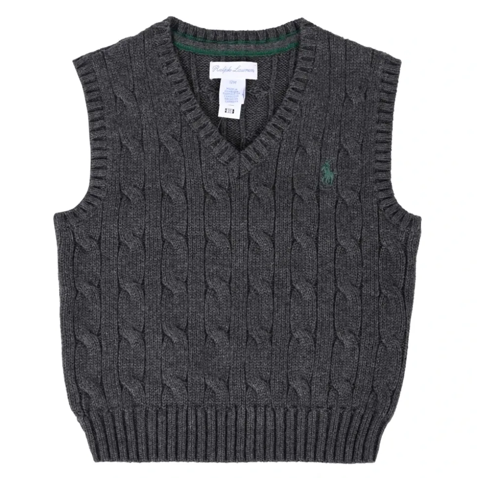 Kleur: GrijsBeschrijving: Grijze vesttrui met blauwe kabels, met V-hals en geribbelde zoom. Het is versierd met een iconisch geborduurd groen paard op de borst.Details: 100% katoen. Machinewas op 30°C.