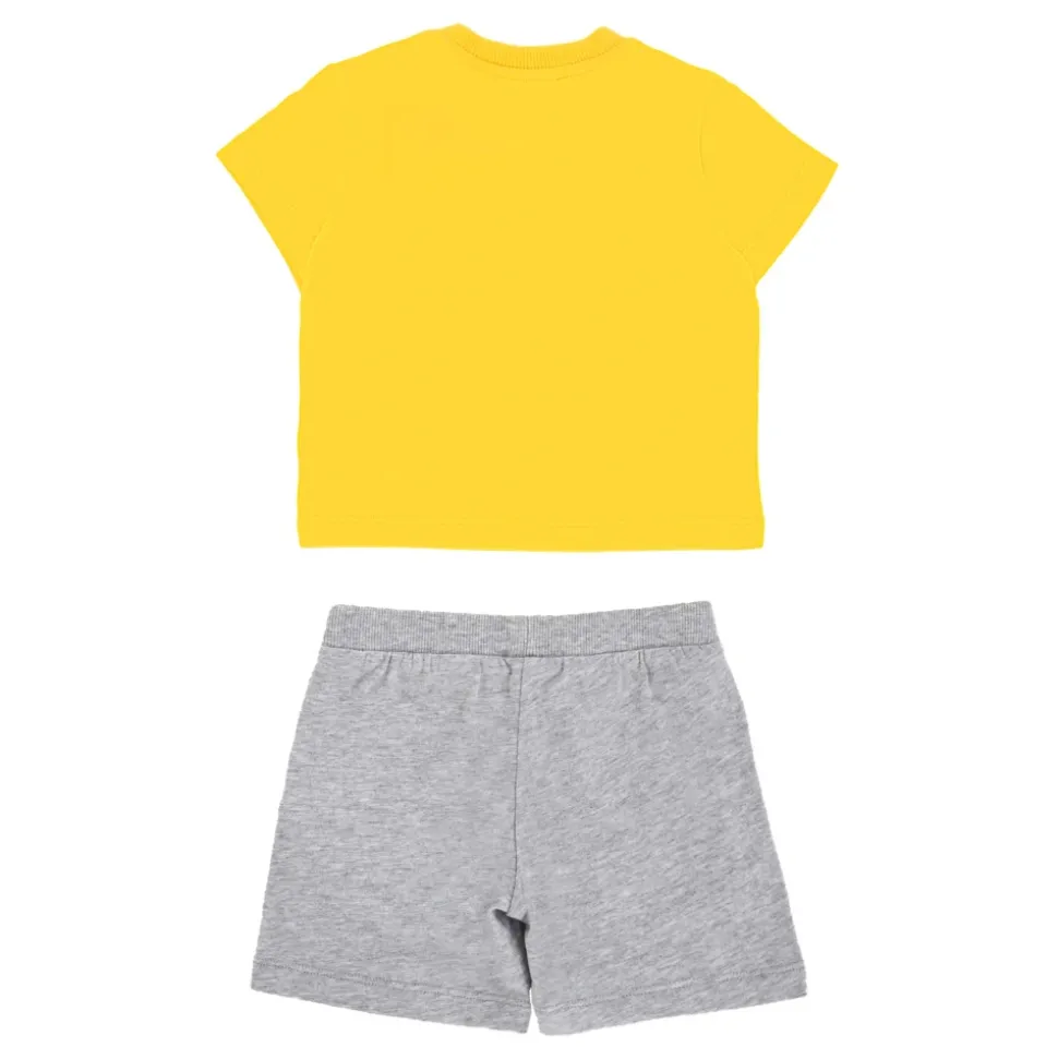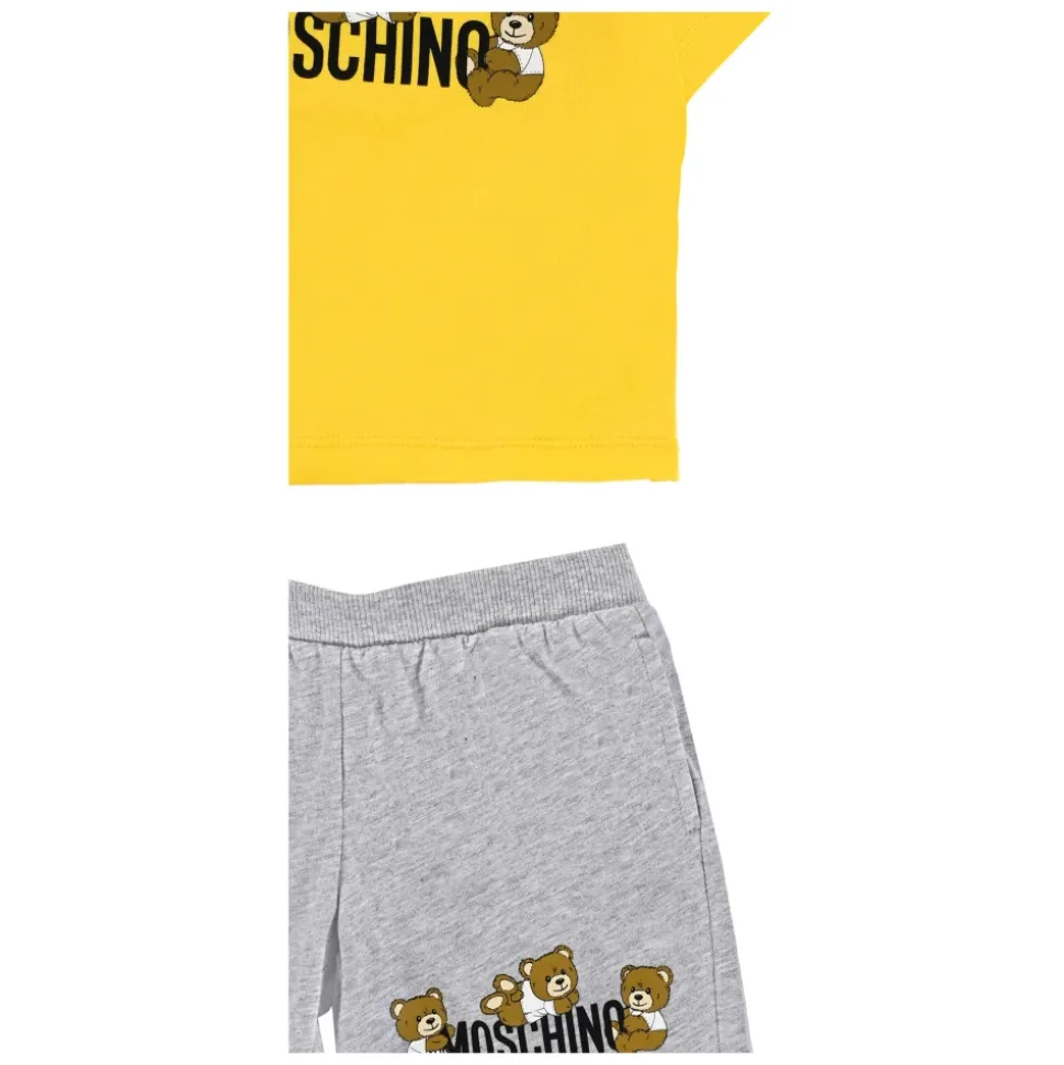 Kleed je kleintje in stijl met deze gele set van Moschino Kids. Gemaakt van 100% katoen, deze set bestaat uit een korte mouwen t-shirt met een geribbelde ronde hals en zoom, en drukknoopsluiting op de schouder, gecombineerd met grijze shorts met een elastische taille en zijzakken. Versierd met een zwart logo en drie Teddy Bears, is deze set zowel comfortabel als modieus. Machinewasbaar op 30°C.