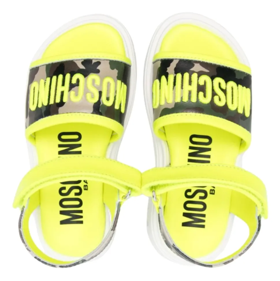 Upgrade de stijl van je kleine jongen met deze Moschino Kids sandalen in levendige gele fluo kleur en camouflagepatroon. Gemaakt van zacht 100% leer, deze in Italië gemaakte sandalen hebben een rond neusontwerp, sluiting aan de voorkant met klittenband, geborduurd logo aan de voorkant en rubberen zool.
