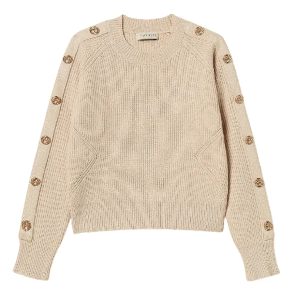 De Twinset geribbelde trui met ovale T-knopen combineert verfijnde eenvoud met een geribbelde viscosemix en de kenmerkende ovale T-logoknopen, waardoor hij ideaal is om in laagjes te dragen of op zichzelf. Belangrijkste kenmerken: Beige | Viscosemix | Elastische geribbelde structuur voor stretch en comfort | Sluiting met knopen aan de voorkant met ovale T-logoknopen | Geribbelde textuur | Ronde halslijn | Kenmerkende ovale T-logoknopen | Afmetingen en pasvorm: Aansluitend silhouet | Samenstelling en verzorging: 72% Viscose | 28% Polyester | Handwas. Niet bleken. Niet in de droogtrommel. Strijken op max. 110 °C. Chemisch reinigen met perchloorethyleen. Plat drogen in de schaduw.