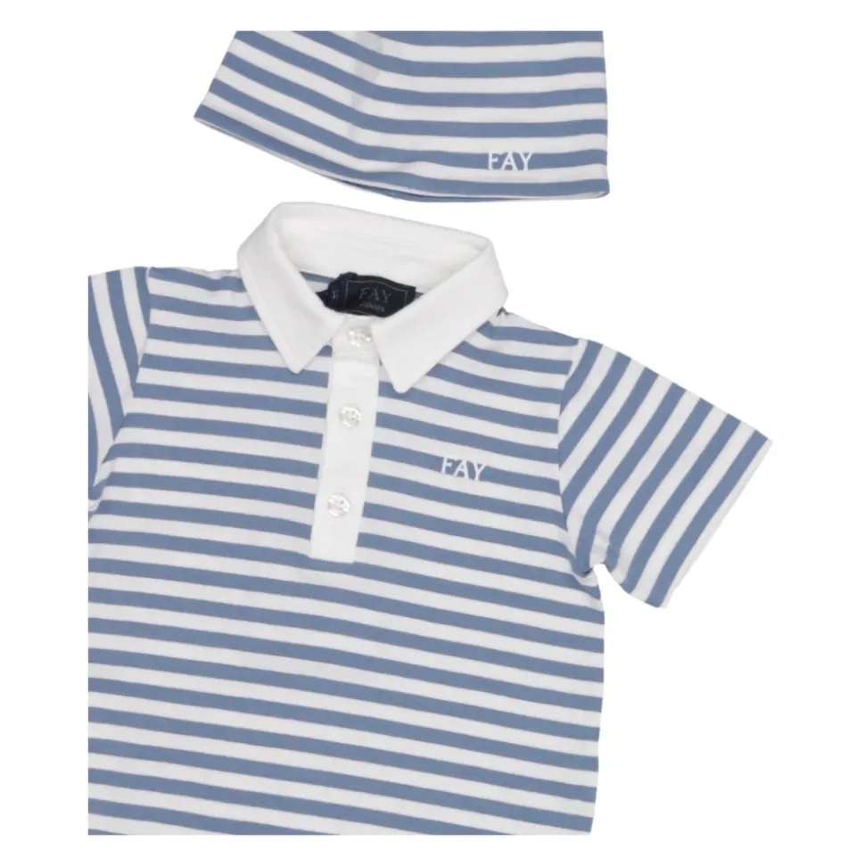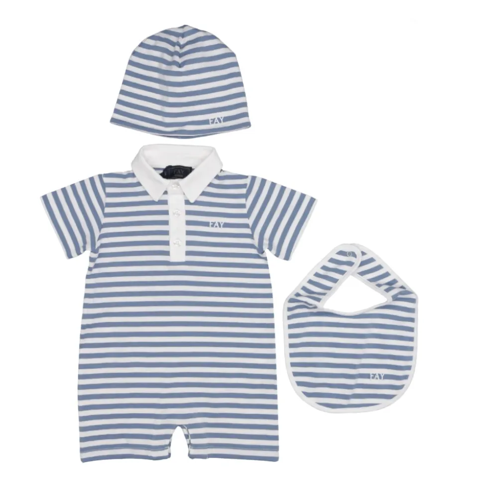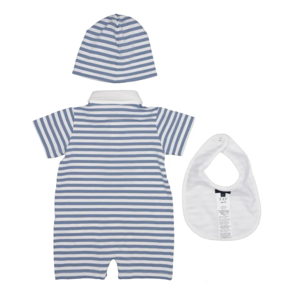Kleed je kleine heer in stijl met deze Fay katoenen set met een romper, slabber en hoed. De romper heeft een kraag, shorts en korte mouwen, samen met drukknoopsluitingen aan de onderkant en op de borst. Compleet met geborduurde logo’s, gestreept patroon en een rekbare hoed.