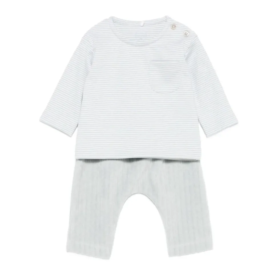 De Laranjinha Gestreepte Katoenen Set combineert een klassiek gestreept design met een katoenen constructie voor comfortabel dagelijks gebruik. Belangrijkste kenmerken: Grijs | Katoen | Gestreept patroon | Set