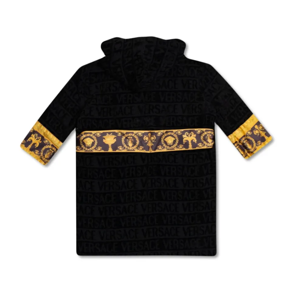 Zwarte badjas met capuchon voor kinderen van Versace Home. Gemaakt van textuurkatoen met een logo, dit item heeft afwerkingen met het kenmerkende Barok-motief van het label, details van het Medusa-hoofd, een bindceintuur, twee steekzakken en 3/4 mouwen.