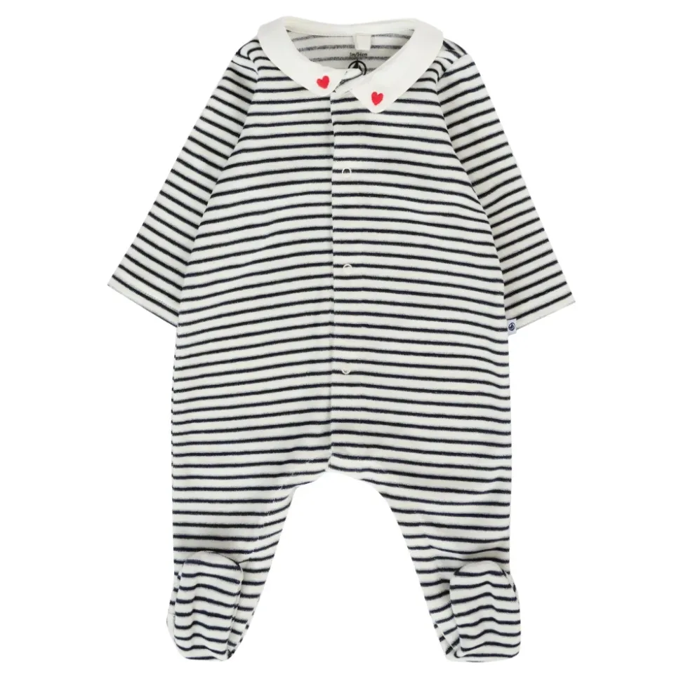 Kleed je kleintje in stijl met deze witte en blauw gestreepte chenille jumpsuit van Petit Bateau. Met lange mouwen, een ronde kraag, drukknopen aan de voorkant en tussen de benen en voeten, is deze jumpsuit versierd met geborduurde rode harten op de kraag. Gemaakt van 100% katoen, is het zowel comfortabel als gemakkelijk te onderhouden met machinewas op 40°C.