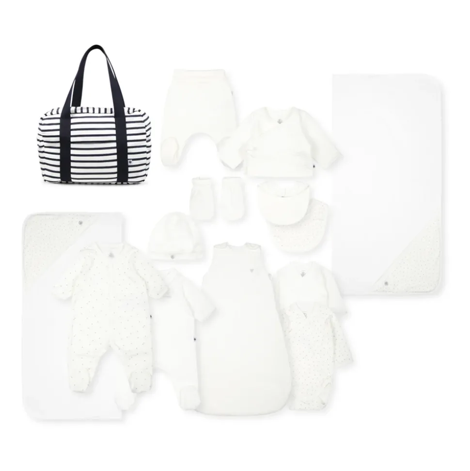 Kleed je pasgeborene in stijl met deze Petit Bateau wit gestreepte katoenen luiertas set. Deze set bevat 2 rompers, 2 body’s, 1 baby bootie, 1 wikkeldeken, 1 slaapzak, 1 slab, 1 muts, 1 paar wanten en 1 vierkant badhanddoek. De ivoorkleurige chenille romper heeft lange mouwen, een V-hals, drukknoopsluiting en schattige hartjesprint. De witte katoenen romper heeft lange mouwen, een Peter Pan kraag, drukknoopsluitingen en een logodetail. Maak de look compleet met de lange mouw body, zware katoenmix wikkeldeken, romper, slab, muts, wanten en geribbelde chenille slaapzak. Gemaakt van 100% katoen. Machinewasbaar op 30°C.