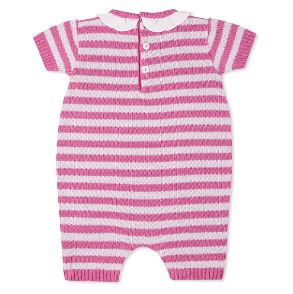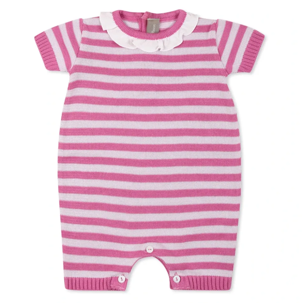 Kleed je kleintje in stijl met deze fuchsia gestreepte romper van Little Bear. Gemaakt in Italië van 100% katoen, deze romper heeft korte mouwen, ronde hals met ruches, knoopjes op de rug en tussen de benen, en geribbelde mouwen en enkels. Alleen handwas.
