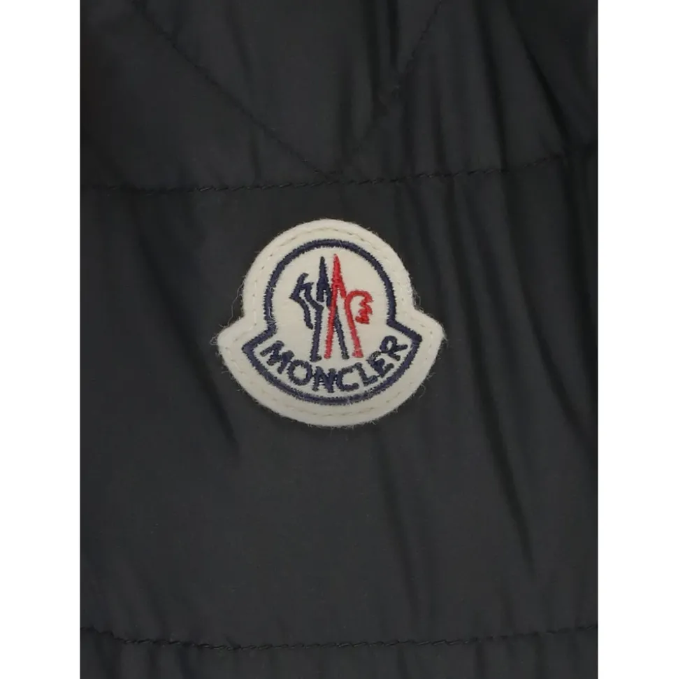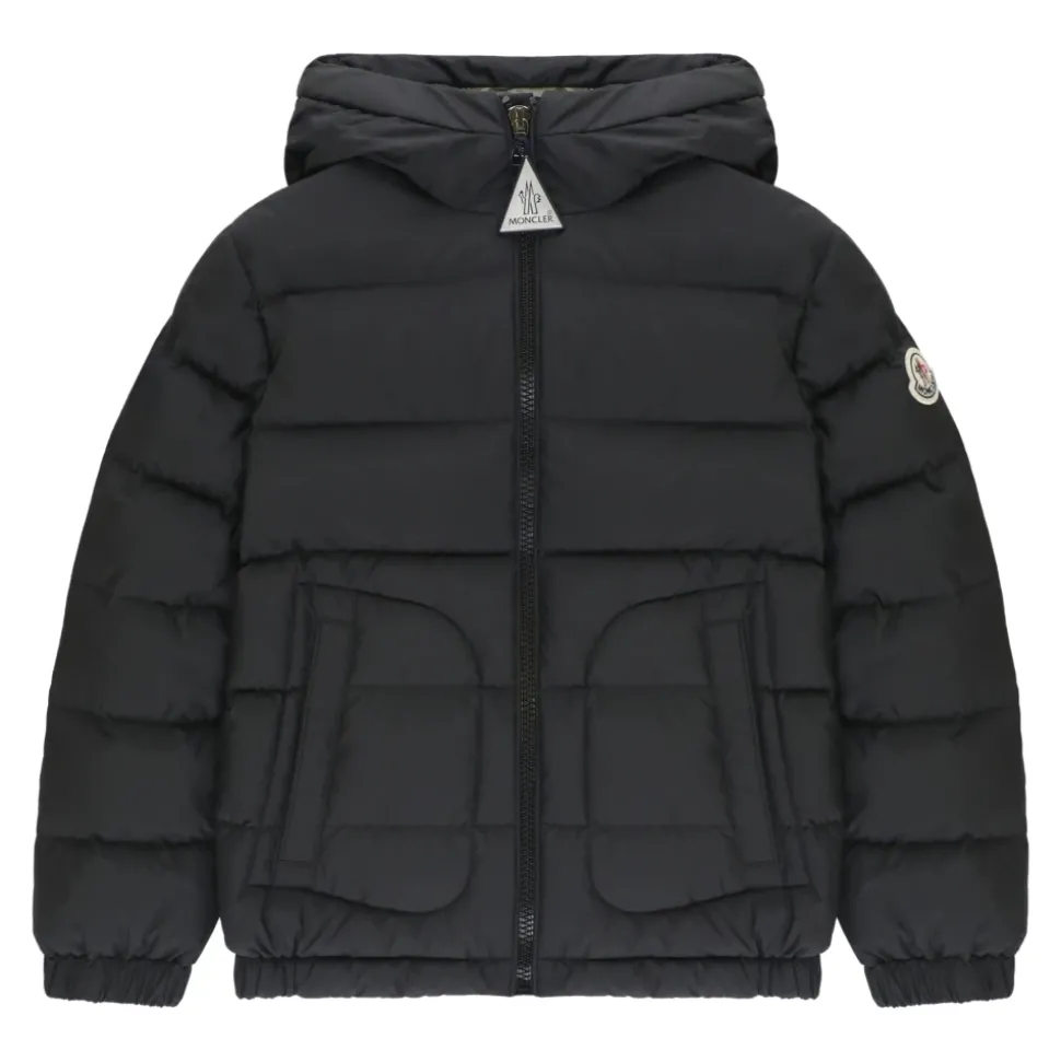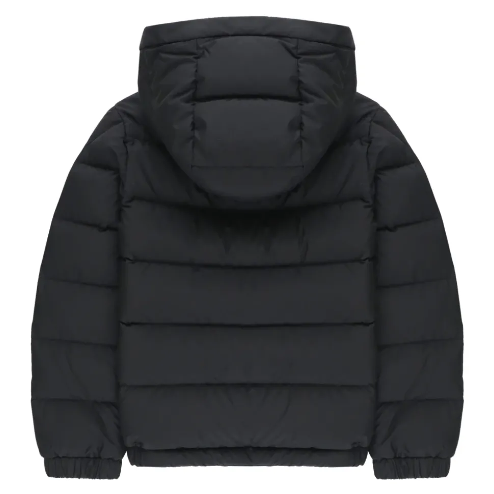 Blijf warm en stijlvol met deze zwarte Moncler Enfant gewatteerde donsjas voor jongens. Met capuchon, lange mouwen, twee voorzakken met knopen, logo-patch op de linkermouw en ritssluiting aan de voorkant.