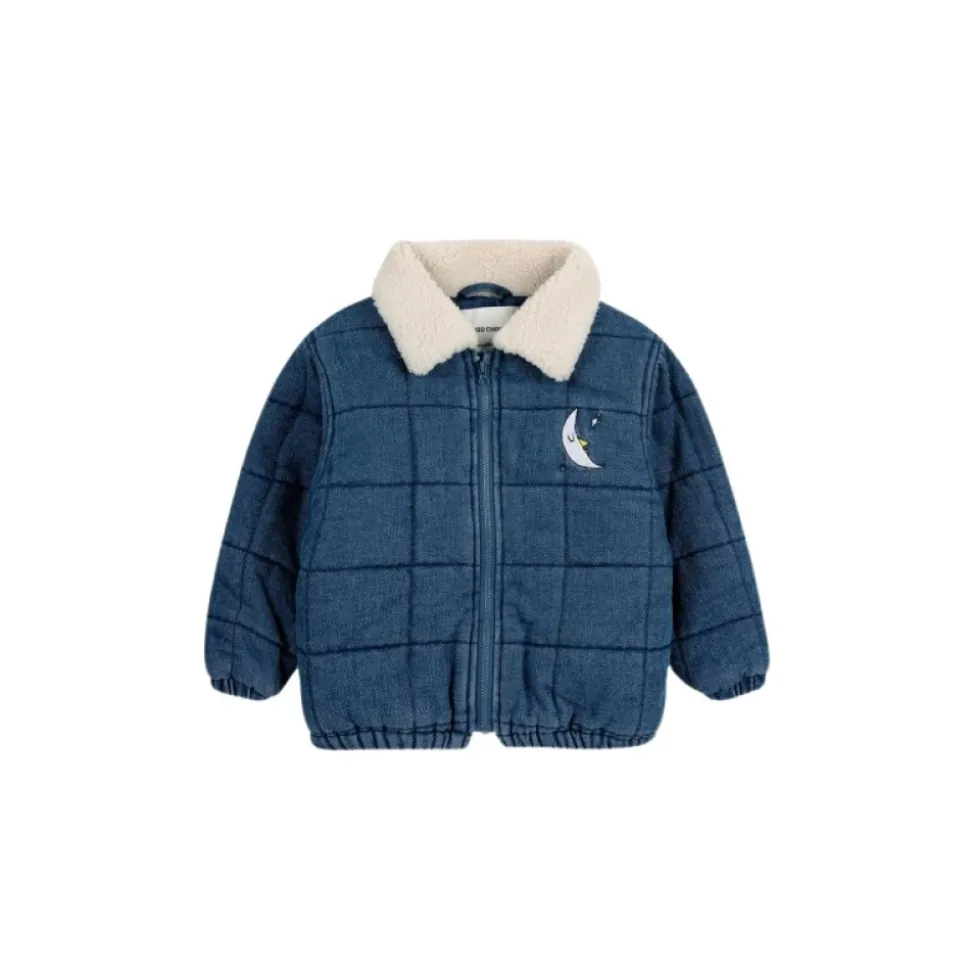 Gewatteerde denim bomberjack voor babys van het Spaanse merk Bobo Choses. Met een geborduurde maan aan de linkerkant. Ontdek de volledige winter 2024 babycollectie van Bobo Choses bij Little Michèle et Noelle in Bastia of op onze e-shop. 70% katoen, 30% elasthaan. Gemaakt in Spanje.