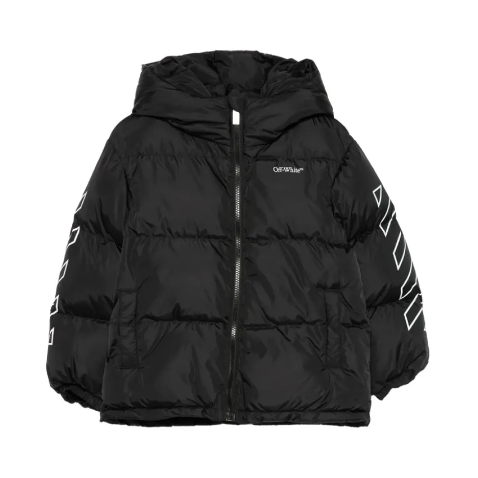 Blijf warm en stijlvol deze winter met deze zwarte Off White gewatteerde winterjas voor jongens. Voorzien van een capuchon, ritssluiting aan de voorkant, pijlprint mouwen en opgestikte zakken. Gemaakt van 100,0% nylon.