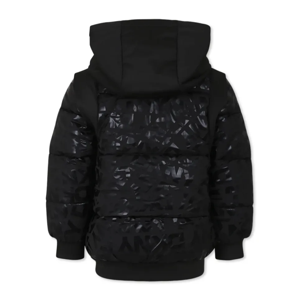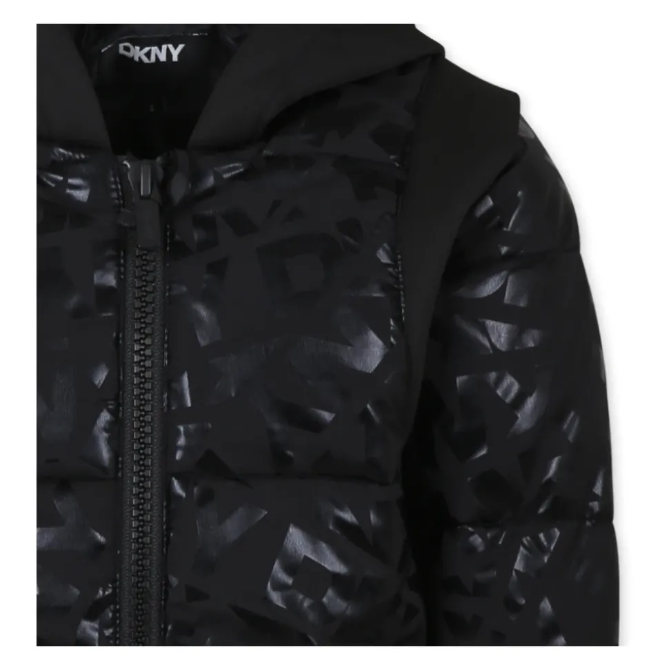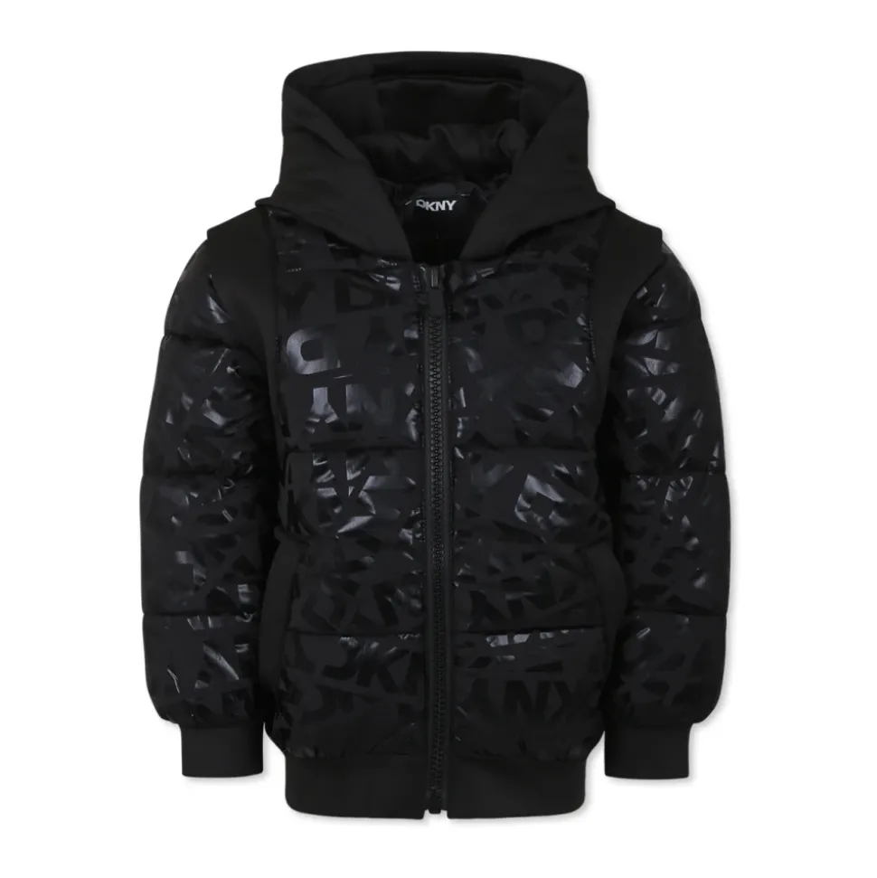 Houd je kleintje warm en stijlvol met deze zwarte DKNY winterjas. Gemaakt van 100% polyester, deze zware jas heeft een gewatteerd en doorgestikt ontwerp, lange mouwen, capuchon, ritssluiting aan de voorkant, zijzakken, geribbelde manchetten en zoom. De allover logoprint en het gelabelde embleem aan de zijkant voegen een trendy touch toe. Machinewasbaar op 30°C.