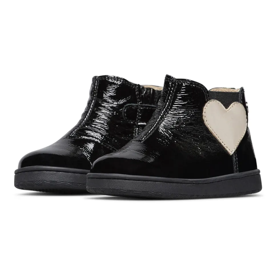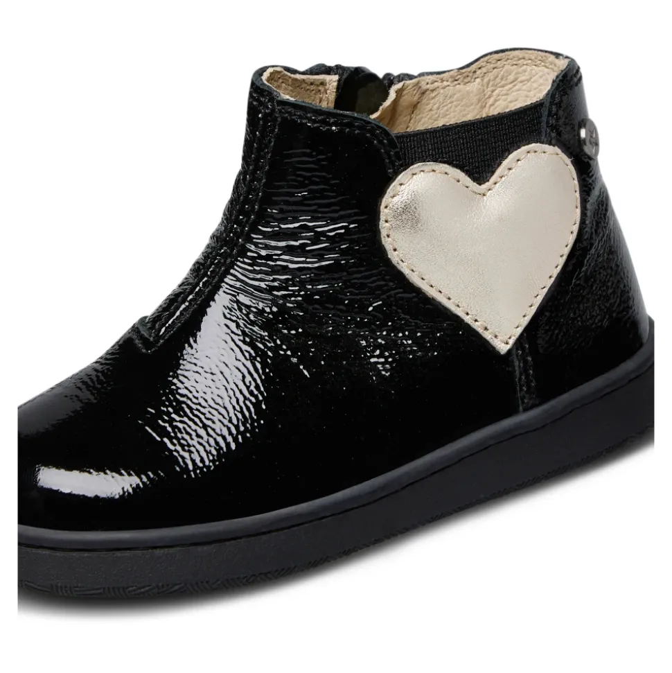 De Naturino GLARNY HIGH 2 enkellaars combineert glanzend lakleer met een glitterhartdetail voor een opvallende, alledaagse look. De interne rits en elastische inzet zorgen voor een snelle, comfortabele pasvorm. Belangrijkste kenmerken: Zwart | Zwart Goud | Lakleer | Ritsopening aan de binnenkant | Elastische inzet aan de zijkant | Leren binnenzool | Ronde neus | Glitterhartdetail aan de zijkant | Enkelhoge silhouet | Samenstelling & verzorging: Lakleer (bovenkant) | Leer (voering) | Leer (binnenzool) | Rubber (buitenzool)