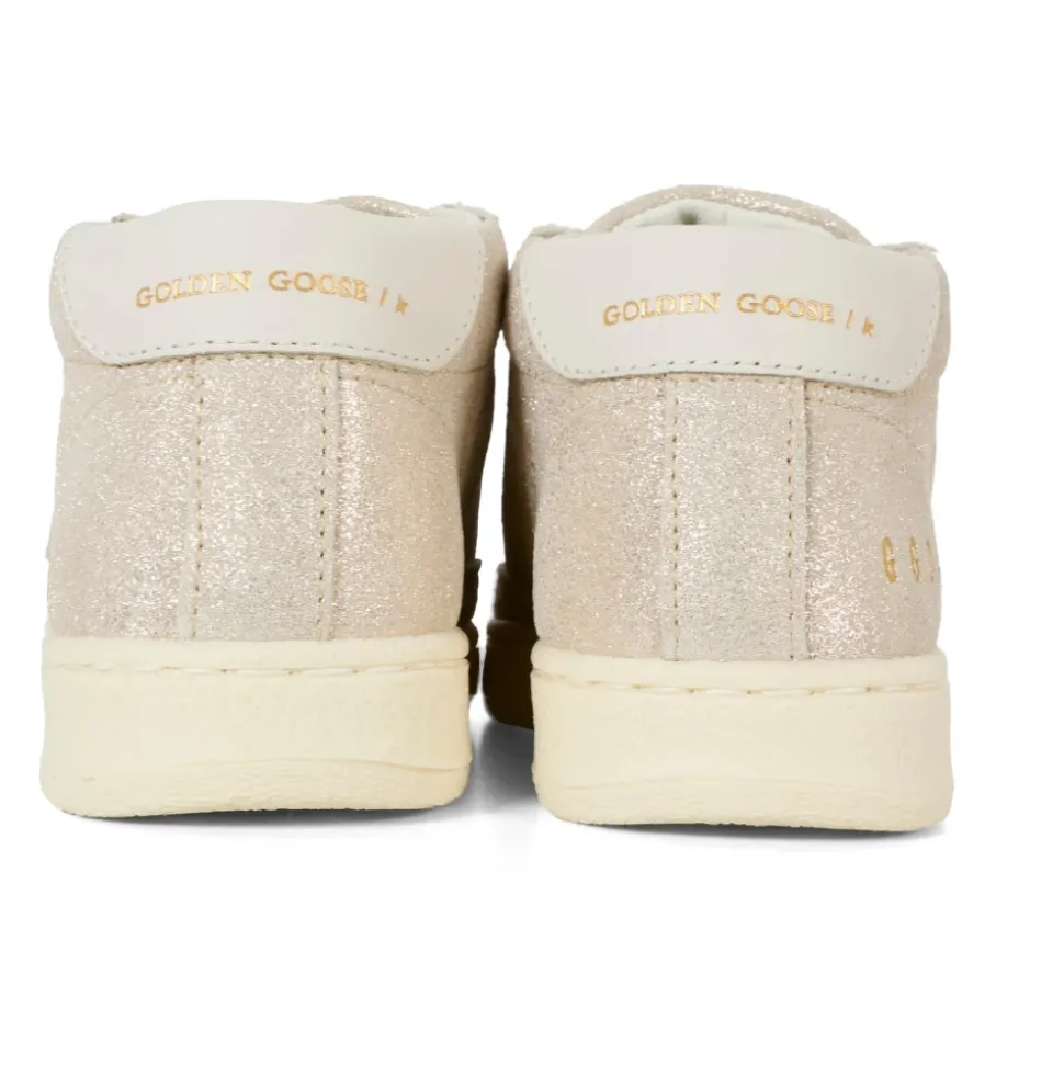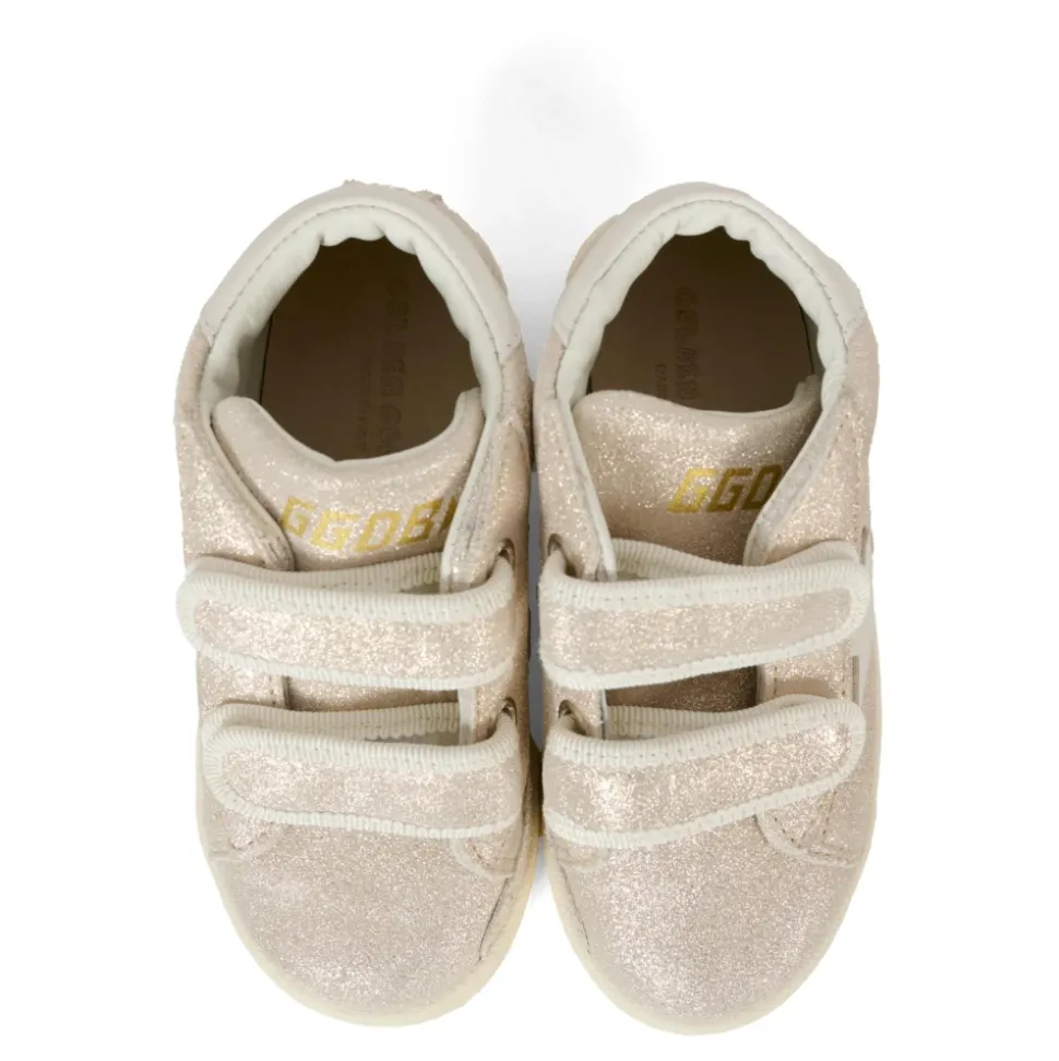 Verrijk de stijl van je kleine meisje met deze Golden Goose beige sneakers. Gemaakt in Italië, hebben deze sneakers een glitter bovenwerk, rubberen zool, twee bandjes met klittenbandsluiting, ronde neus en zijn versierd met een witte ster en logo. Gemaakt van 100% leer.