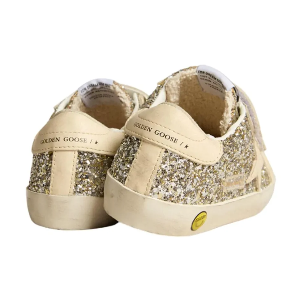 Golden Goose Kinder sneakers voor jongens met glinsterend platina bovenwerk en crèmekleurige leren details. Voorzien van een crèmekleurige leren klittenbandsluiting met contrasterend logo, smiley op de foxing en vintage behandeling. Gemaakt van 44% PET, 32% LH, 23% CO, 1% PU stof.