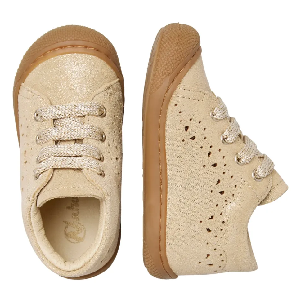 First step shoes with glittered suede upper and decorated on the neckline with a decorative gold micro print. Construction features structured heel and padded neckline for optimal walking support. Lace-up closure, leather lining and insole, rubber bottom with reinforced toe.