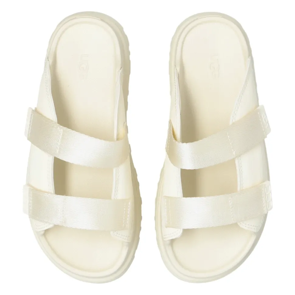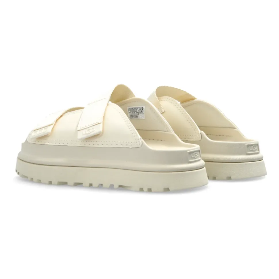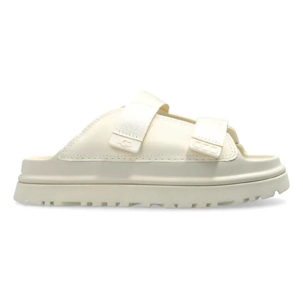 De UGG GoldenGlow Slide combineert een sportief slide-silhouet met een lichtgewicht, veerkrachtige zool voor dagelijks gebruik. Het ontwerp is gericht op eenvoudige verstelbaarheid en stabiele grip voor betrouwbaar comfort onderweg. Belangrijkste kenmerken: Beige | Crème | Synthetisch | Lichtgewicht, veerkrachtige EVA-loopzool | Gripvast profiel voor stabiliteit | Gedempte middenzool | Drie verstelbare klittenbandsluitingen | Gemakkelijk aan en uit te trekken | Slip-on slide-silhouet | Voorgevormd voetbed | TPU-banduiteinde met logo | Afmetingen en pasvorm: Zoolhoogte op het hoogste punt: 4 cm | Samenstelling en verzorging: Synthetisch bovenwerk | TPU-banduiteinde | Voering van textiel | EVA-middenzool | EVA-loopzool
