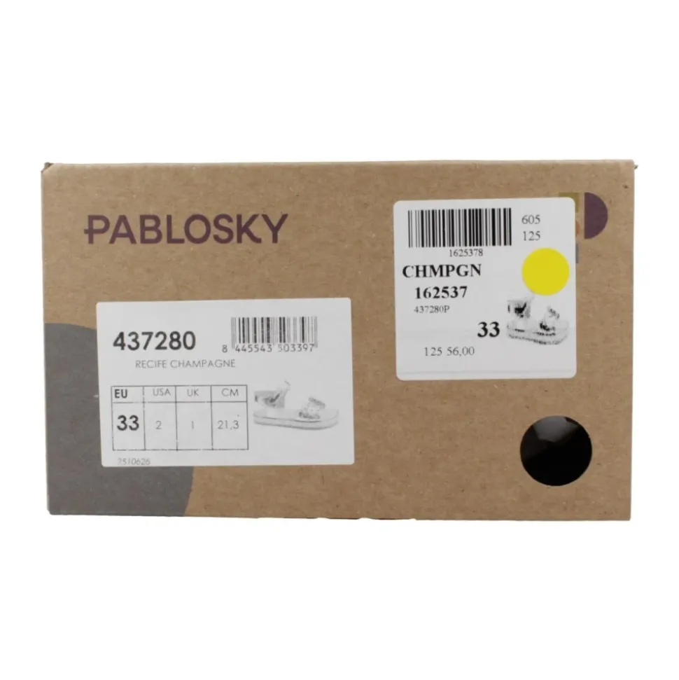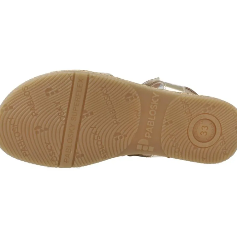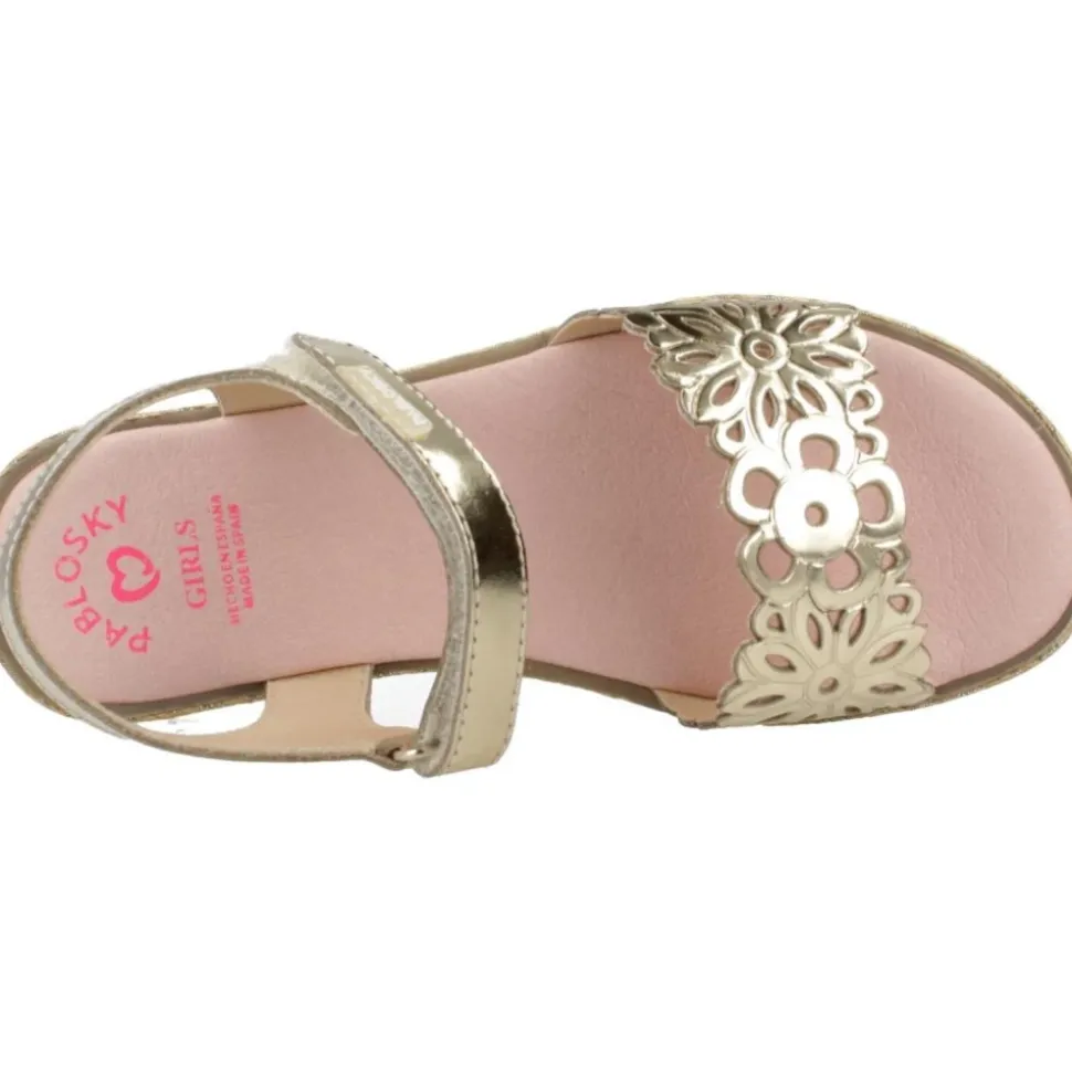 Upgrade de zomerse look van je kleine meid met deze Pablosky sandalen in een elegante gouden afwerking. Met een bloemig uitsnijdingsdetail combineren deze sandalen stijl en comfort, perfect voor speeltijd en buitenplezier. Het ontwerp met verstelbare sluiting zorgt voor een goede pasvorm, terwijl de flexibele zool elke stap vergemakkelijkt. Ideaal voor elke zomerse gelegenheid.