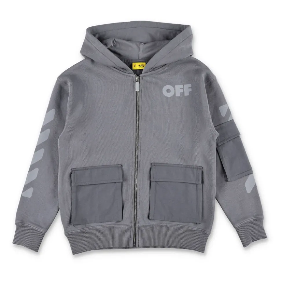 Upgrade de street style van je kleine man met deze Off-White Kids zip hoodie in gewassen grijs. Gemaakt van zacht fleece katoen, met pijl graphics op de mouwen, voorflapzakken en een cargozak op de arm voor een functionele twist. Compleet met tonale ‘OFF’ print op de borst, biedt deze hoodie zowel stijl als comfort in een reguliere pasvorm.