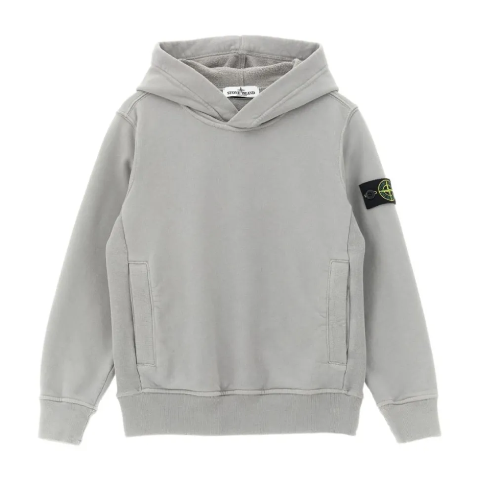 Stone Island Kids grijze fleece sweatshirt met opgestikte zakken, lange manchetmouwen en kompasbadge. Perfect voor jongens.