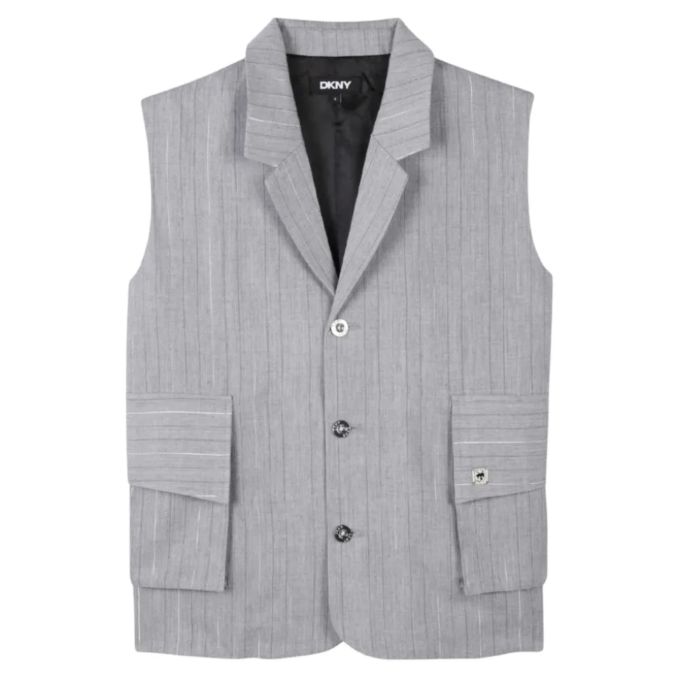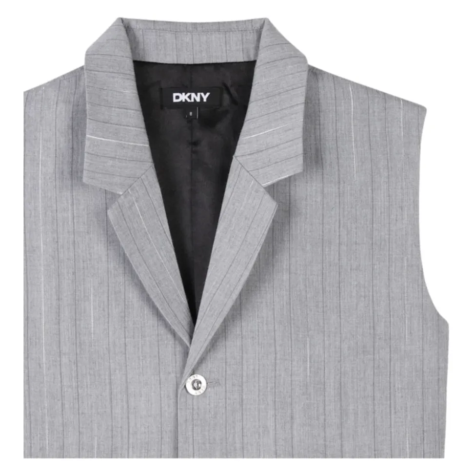 Upgrade de stijl van je kleine meid met deze DKNY Kids grijze jas met een zilvergestreept patroon. Dit mouwloze ontwerp wordt geleverd met twee zijzakken, een metalen logo en een regular fit. Gemaakt van 65% polyester, 34% viscose en 1% metallic vezels met een voering van 100% polyester.