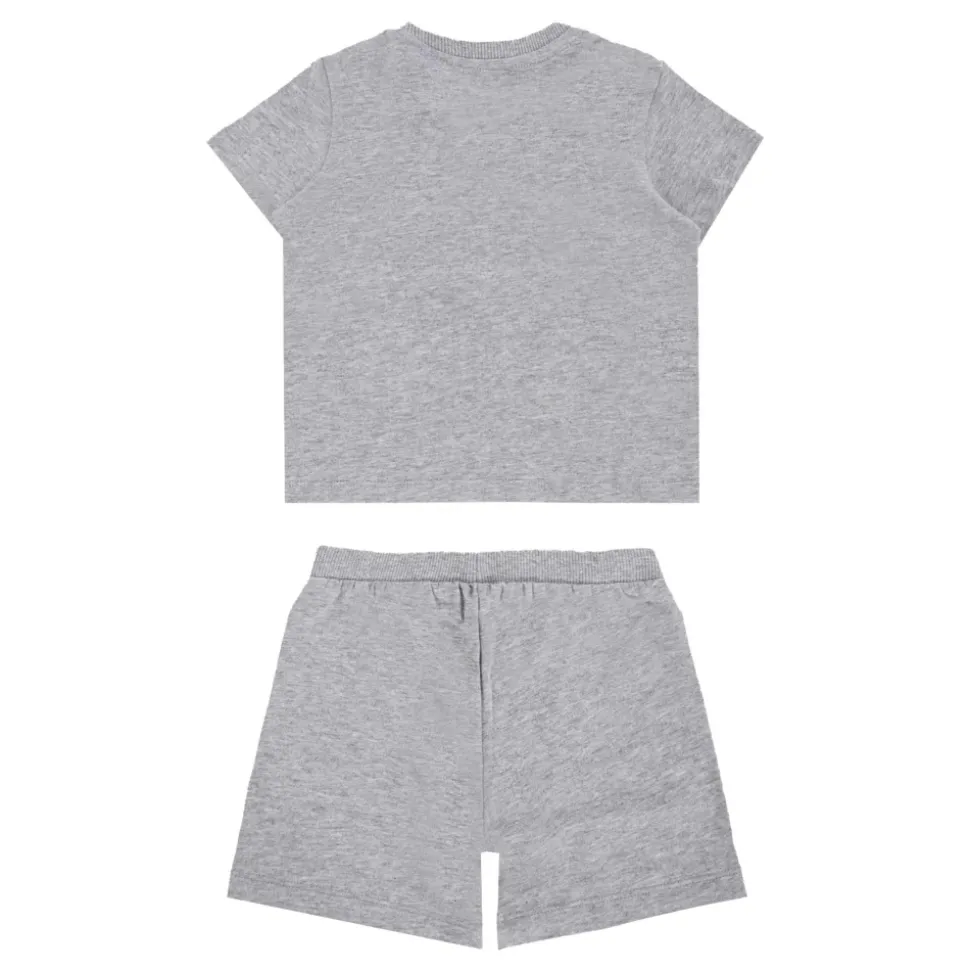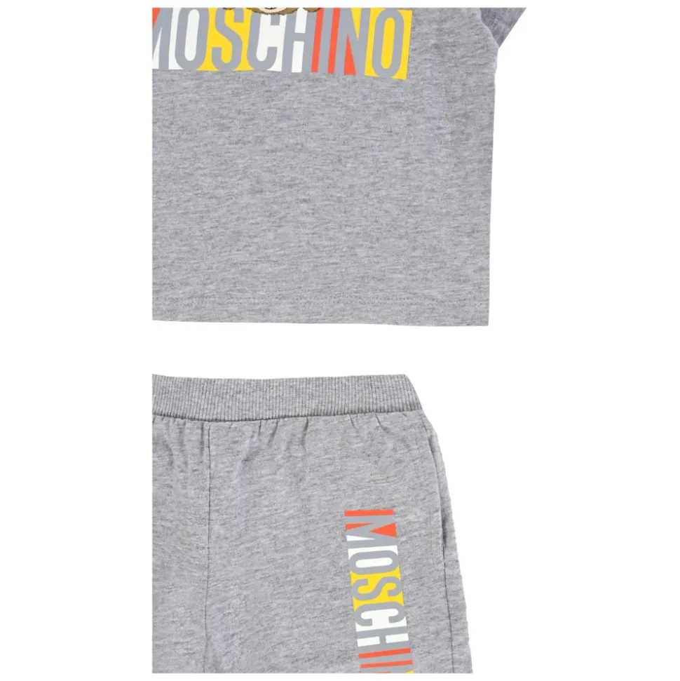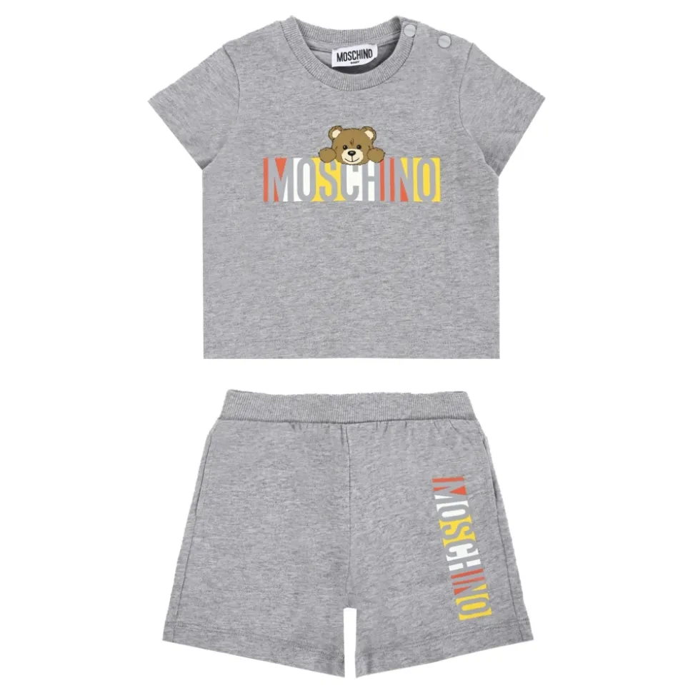 Kleed je kleintje in stijl met dit grijze pak van Moschino Kids. Gemaakt van 100% katoen, deze set bevat een korte mouwen t-shirt met een geribbelde ronde hals en drukknoopsluiting, en shorts met een elastische taille en zijzakken. Versierd met een schattige Teddybeer en een multicolor logo. Machinewasbaar op 30°C.