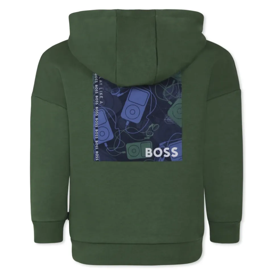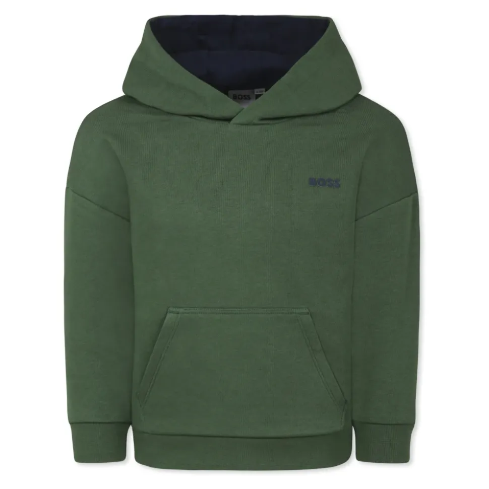 Upgrade de garderobe van je kind met deze groene sweatshirt van Hugo Boss. Gemaakt van een geborsteld katoenmengsel, met lange mouwen, capuchon, voorzak, geribbelde manchetten en zoom. Het rubberen logo op de borst en de print op de achterkant voegen een stijlvolle touch toe. Gemaakt van 87% katoen en 13% polyester. Machinewas op 30°C.