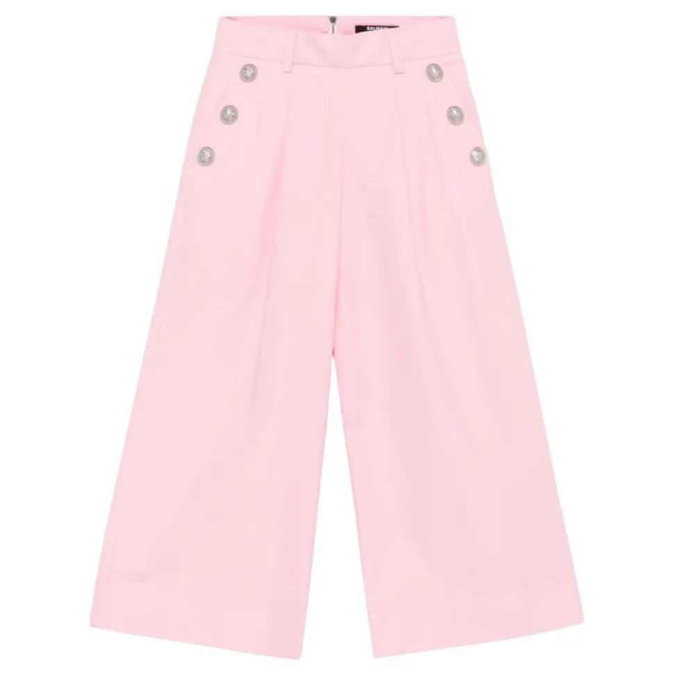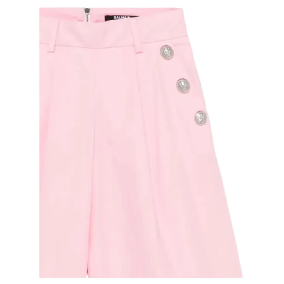 De Balmain High-Waist Palazzo Broek combineert een wijde pijp, geplooide silhouet met de kenmerkende zilverkleurige leeuwenkopknopen van het merk voor een gepolijste, opvallende look. De getailleerde details en paspelzakken maken ze geschikt voor geklede en smart-casual outfits. Belangrijkste kenmerken: Roze | Katoen | Paspelzakken aan de zijkant | Paspelzakken aan de achterkant | Ritssluiting achter | Hoge taille | Plooidetails | Palazzo silhouet | Zilverkleurige knopen met leeuwenkop | Samenstelling & verzorging: 100% katoen | Machinewas koud, fijne was. Niet bleken. Drogen op lage temperatuur. Warm strijken indien nodig.