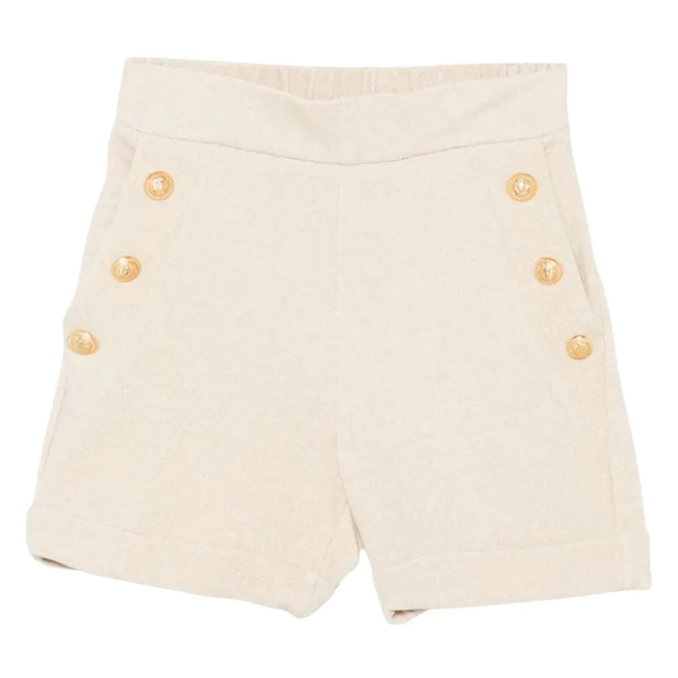 Balmain High-waist shorts die subtiele lurexglans combineren met goudkleurige knopen met leeuwenkop voor een verfijnde, elegante look die geschikt is voor smart-casual outfits. Belangrijkste kenmerken: Beige | Zand | Viscose | Paspelzakken aan de zijkant | Lurex detail | Goudkleurige knopen met leeuwenkop | Omgeslagen zomen | Afmetingen & pasvorm: Hoge taille | Samenstelling & verzorging: 82% viscose | 10% polyester | 6% polyamide | 2% elastaan