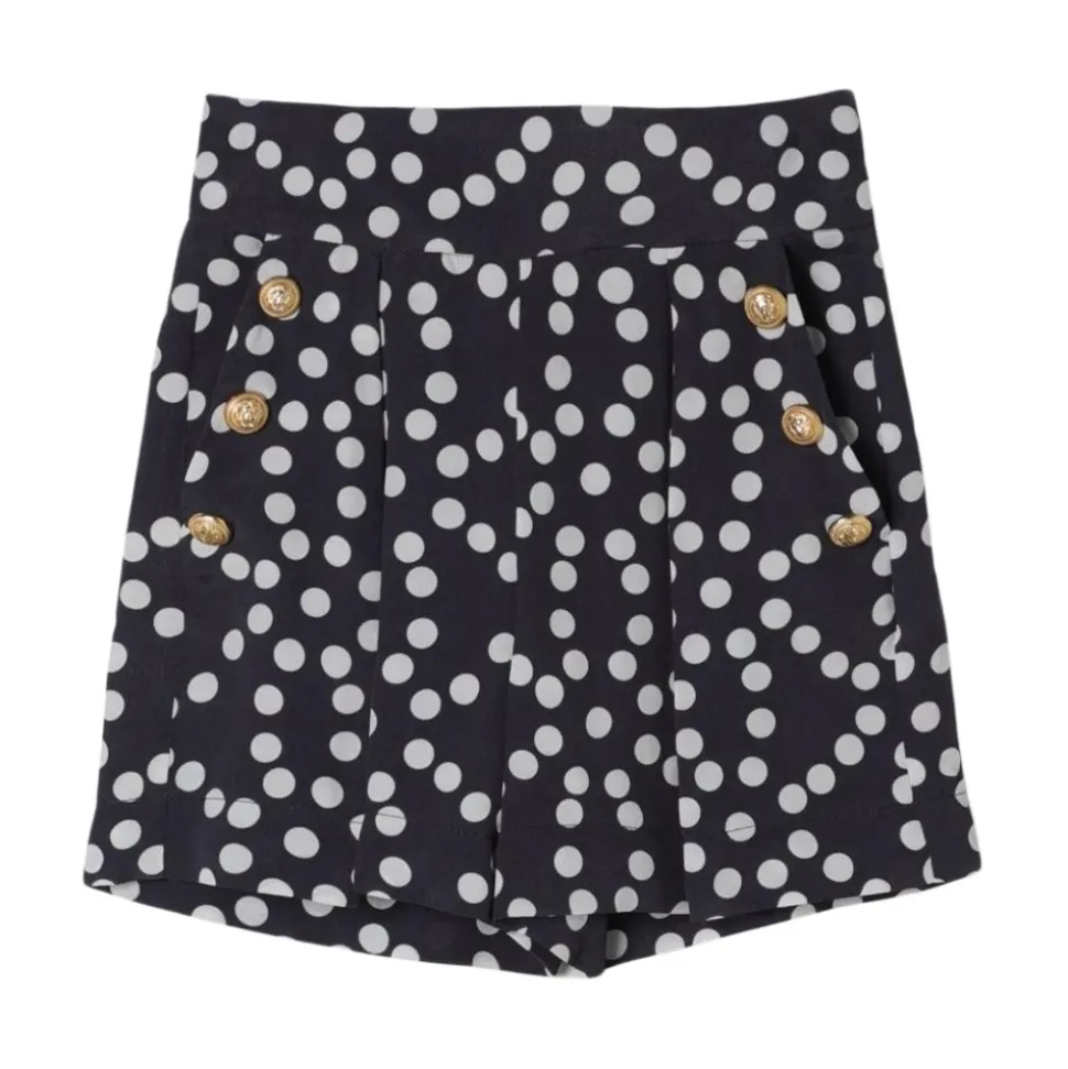 De Balmain high-waisted shorts met stipprint, decoratieve knopen en zakken combineren een klassiek stippenpatroon met een getailleerd high-rise silhouet voor een verzorgde, alledaagse look. Decoratieve knoopaccenten en praktische zakken maken deze shorts zowel stijlvol als functioneel. Belangrijkste kenmerken: Zwart | Zakken | Decoratieve knoopaccenten | Stipprint | High-waisted silhouet | Knoopsluiting aan de voorkant | Afmetingen en pasvorm: High-waisted pasvorm
