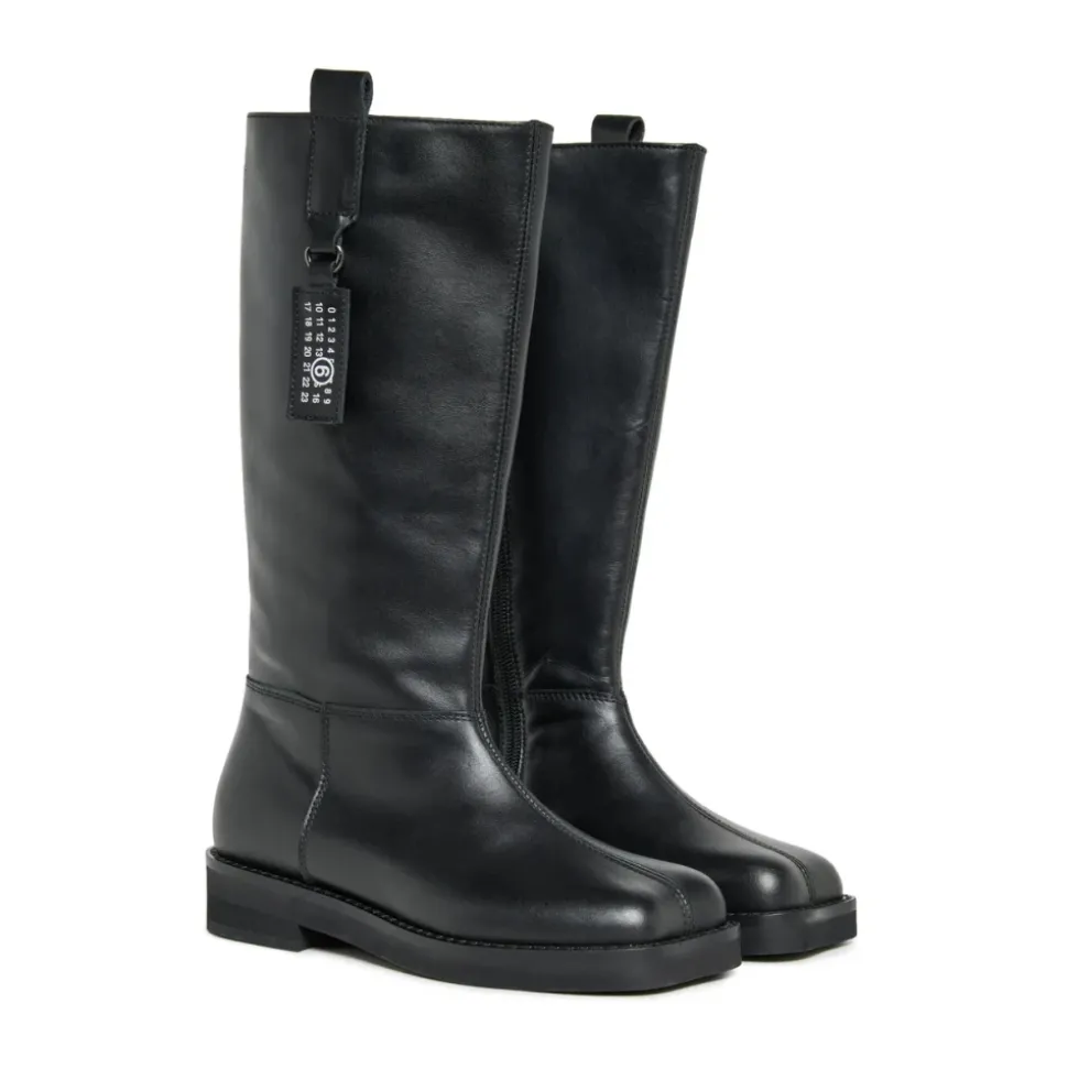 De MM6 Maison Margiela Hoge leren laarzen combineren een modern silhouet met kenmerkende details – een verhoogde naad op de neus en een numeriek logo aan de zijkant – voor verfijnde, modieuze outfits. De ritssluiting aan de binnenkant en de leren rubberen zool maken ze gemakkelijk te dragen en veelzijdig voor een elegante look. Belangrijkste kenmerken: Zwart | Kalfsleer | Ritssluiting aan de binnenkant | Hoge schacht | Verhoogde naad op de neus | Numeriek logo aan de zijkant | Iconisch stikseldetail aan de achterkant | Samenstelling & verzorging: Bovenwerk: 100% kalfsleer | Zool: rubber en leer