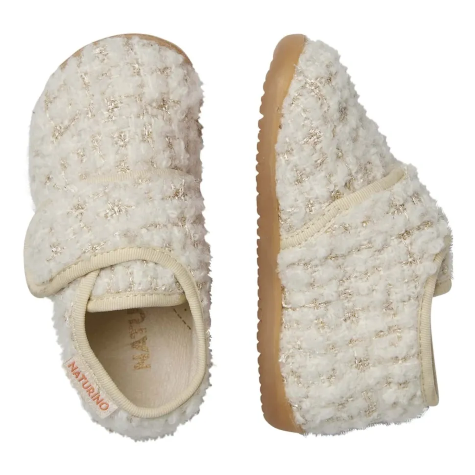 Naturino HOME Pantoffels hebben een stoffen bovenwerk geweven met lurexdraad voor een tweed effect, ontworpen voor comfortabel binnenshuis gebruik met een veilige bandsluiting en rubberen zool. Belangrijkste kenmerken: Beige | Crèmewit | Textiel | Bandsluiting | Rubberen zool | Stoffen bovenwerk | Lurexdraad voor een tweed effect | Samenstelling & onderhoud: Textiel | Lurex | Rubber