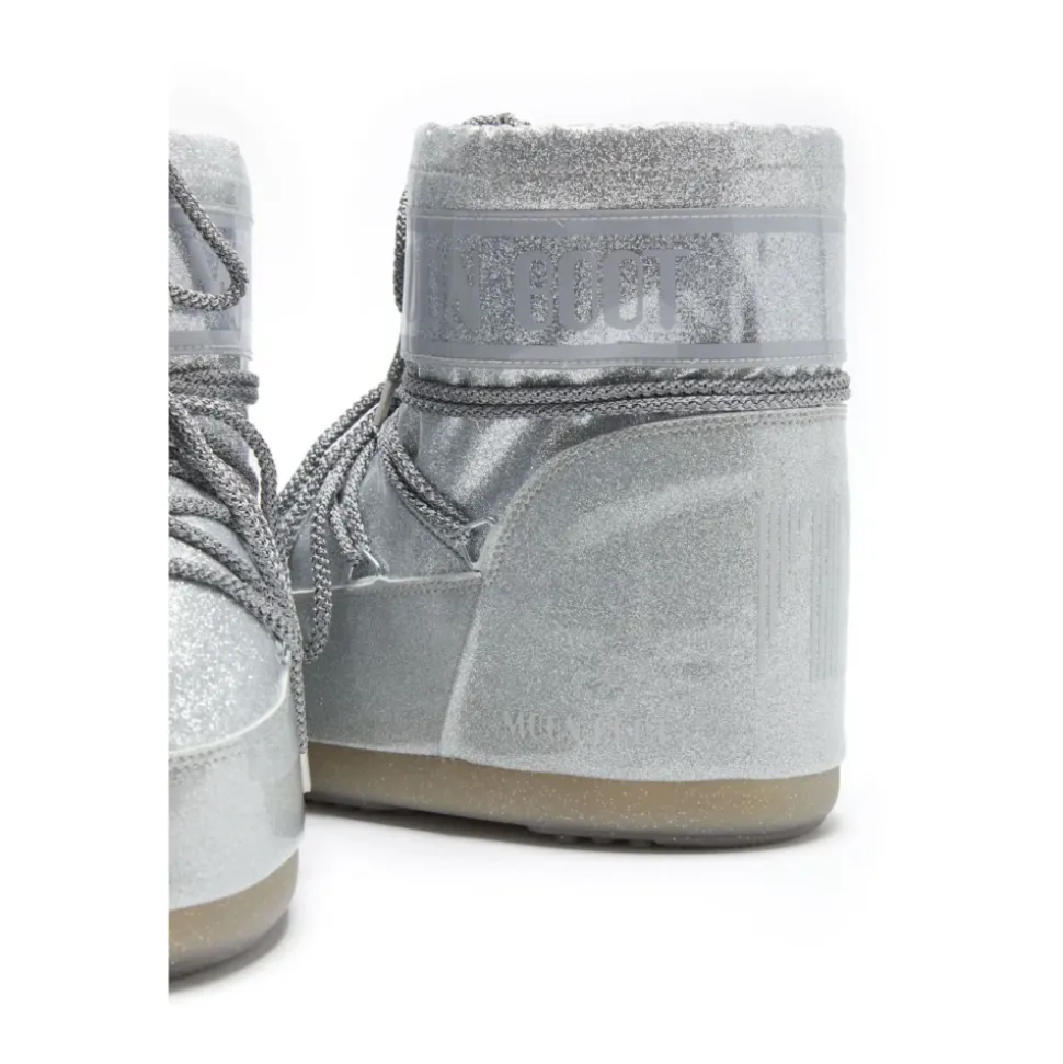 De Moon Boot Icon Low Boot brengt het kenmerkende door de maan geïnspireerde silhouet van het merk naar een glitter design in een lage uitvoering, waarbij geïsoleerd comfort wordt gecombineerd met een rubberen profielzool voor grip in de winter. Belangrijkste kenmerken: Grijs | Zilver | Polyurethaan | 100% waterafstotend | Geïsoleerd | Thermoplastische tussenzool voor lichtgewicht demping | Antislip rubberen profielzool met zuignappen | Slip-on design | Trekkoord aan de bovenkant voor aanpassing | Gekruiste buisvormige veters (decoratief) | Ambidexter (geen links/rechts) | PVC hielstuk en rand | Multisize schuimvoering | Glitter afwerking | Logo-print paneel | Zilverkleurige metalen veteroogjes | Ronde neus | Afmetingen & pasvorm: Aanpasbare multisize schuimvoering vormt zich naar de voet voor een goede pasvorm. | Valt klein; een maat groter wordt aanbevolen. | Samenstelling & onderhoud: 61% polyurethaan | 26% polyester | 10% PVC | 3% polyethyleentereftalaat | Voering: 100% polyester | Zool: 100% thermoplastisch rubber | Verwijder vuil met een zachte, droge borstel. Gebruik een zachte, vochtige doek met een mild reinigingsmiddel om vlekken te verwijderen. Reinig de tussenzool en buitenzool met een zachte borstel, mild reinigingsmiddel en water. Laat drogen op kamertemperatuur. Bewaar in een beschermende tas.