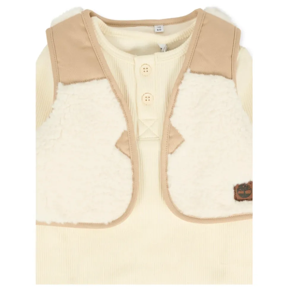 Kleed je kleintje in stijl met deze Timberland ivoorkleurige babygrow set, bestaande uit een geribbelde katoenmix babygrow met lange mouwen en een ronde hals, gecombineerd met een nepbont vest. De babygrow heeft knopen aan de voorkant en drukknopen tussen de benen, versierd met een rubberen logo op de borst. Het set is gemaakt van 58% katoen, 39% polyester, 3% elastaan en kan in de machine worden gewassen op 30°C.