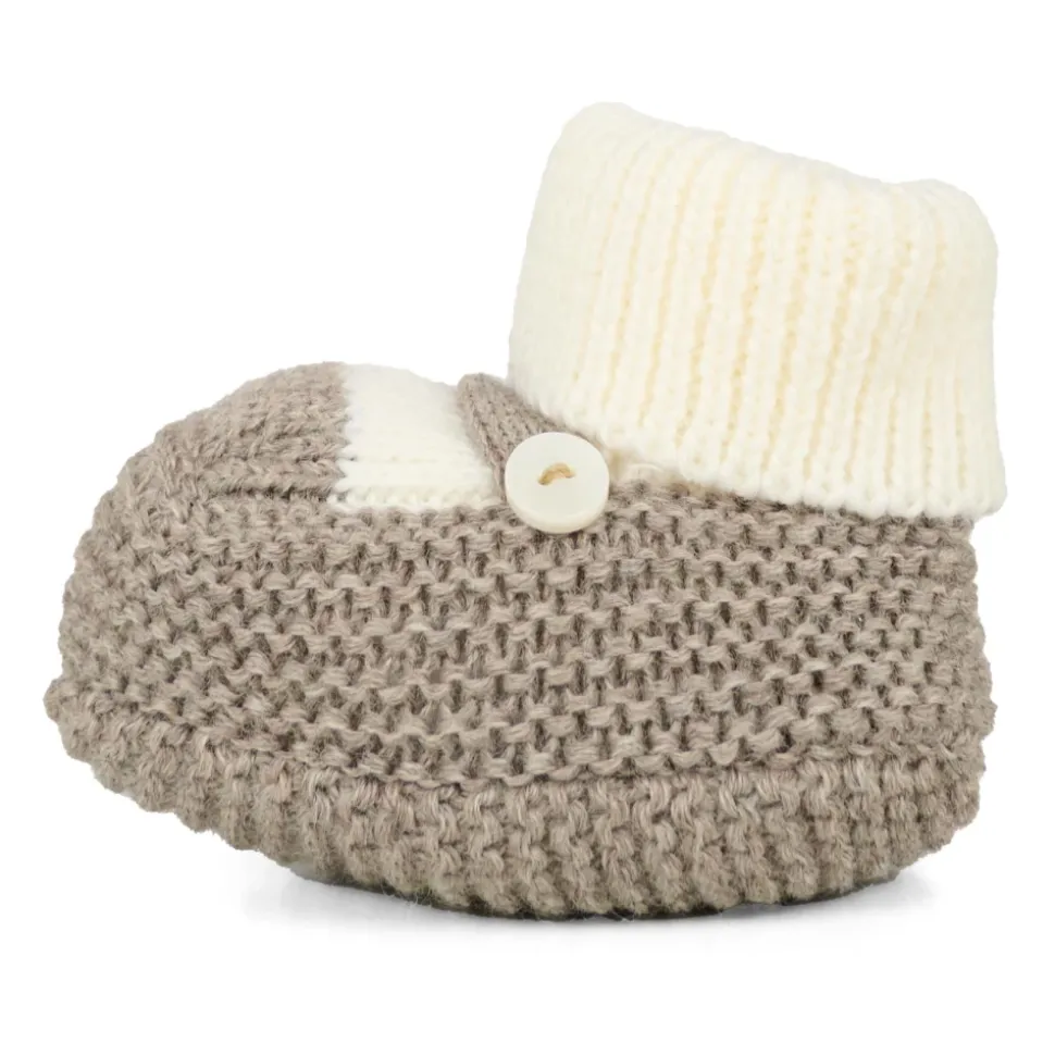 Verwen de voetjes van je kleintje met deze gezellige Little Bear ivoren en grijze binnenschoenen. Voorzien van enkelboeien, trompe l’oeil-effect, parelmoer armband en knoopdetail. Gemaakt in Italië van 100% zuivere wol. Wasinstructies: Wassen op 30°C.