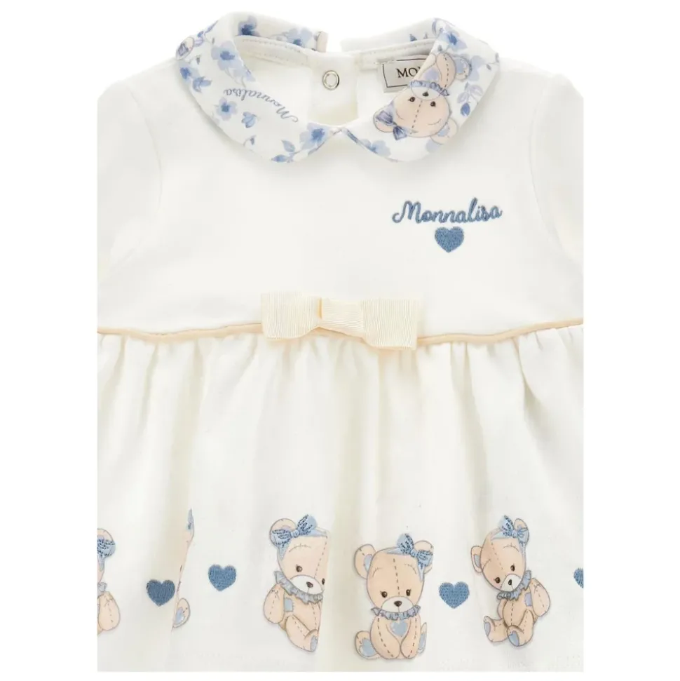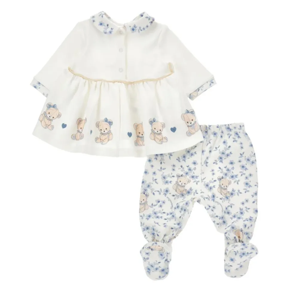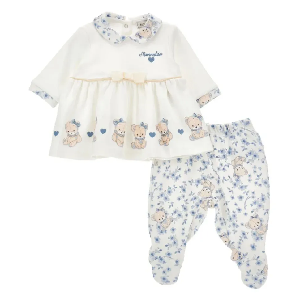 Kleed je kleine prinses in deze schattige Monnalisa-ivoorkleurige geboorteset, met een langemouwenshirt met Peter Pan-kraag, drukknoopsluiting en schattige teddyberenprint. De broek heeft een elastische taille en voetjes, versierd met teddyberen en bloemenprint. Gemaakt van 100% katoen. Machinewasbaar op 30°C.