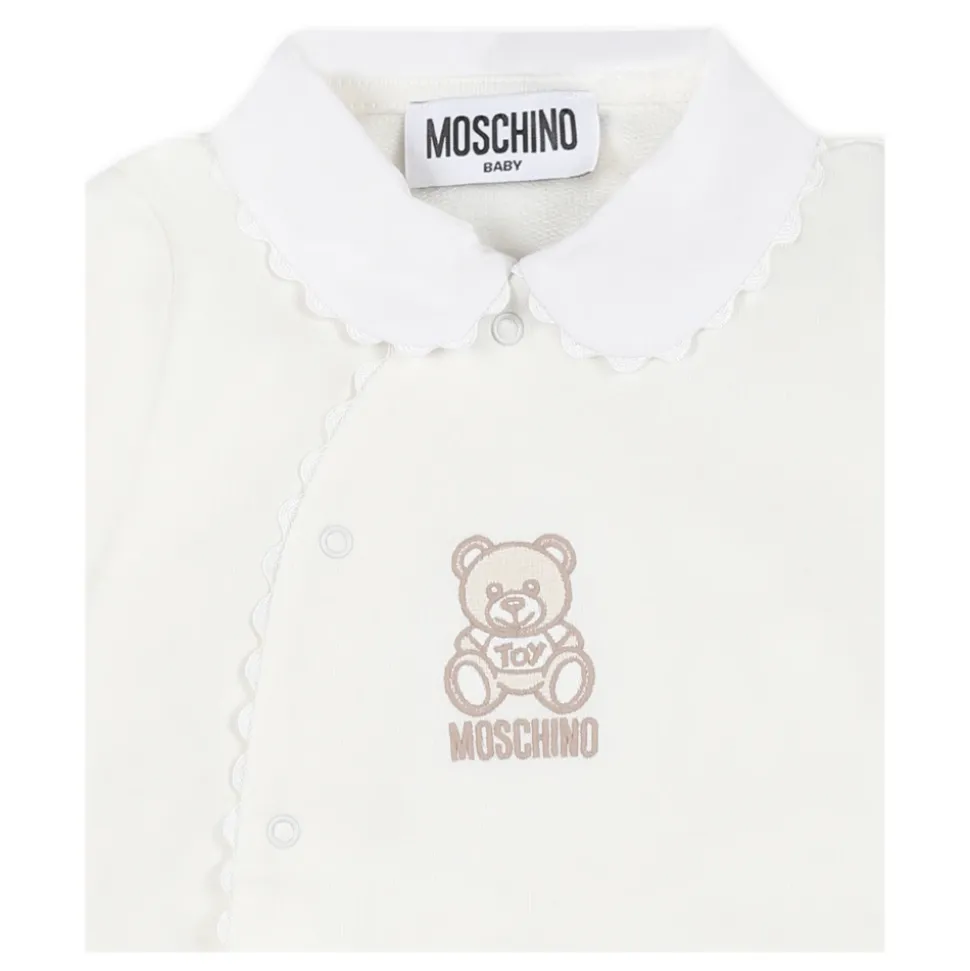 Kleed je kleintje in stijl met deze ivoren katoenen romper van Moschino Kids. Met lange mouwen, een witte Peter Pan-kraag, voetjes, drukknoopsluiting aan de voorkant, geschulpte randen en geribbelde manchetten, is deze romper versierd met het iconische Teddy Bear-logo geborduurd op de voorkant. Gemaakt van 100% katoen, is het zowel comfortabel als gemakkelijk te onderhouden met machinewas op 30°C.