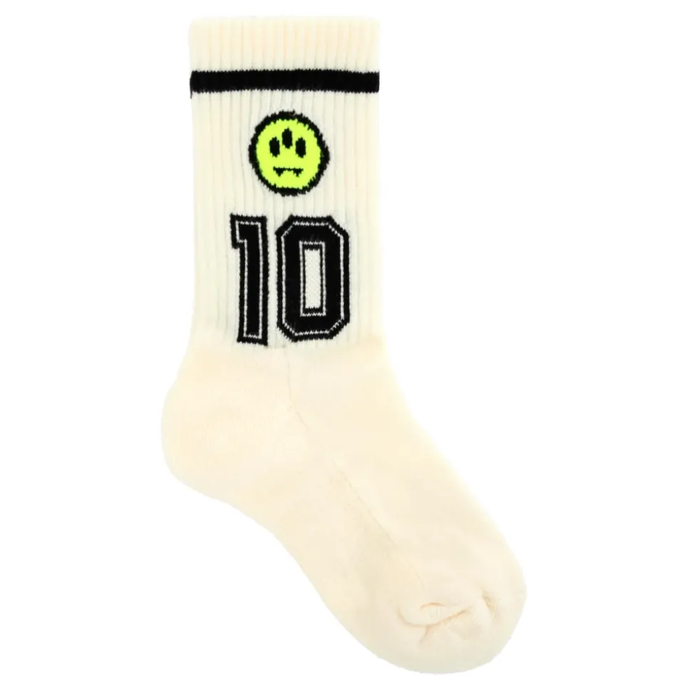 Upgrade de sokkenkast van je kind met deze Ivory terry sokken van BARROW. Voorzien van een geribbelde boord en versierd met de iconische gele smiley en cijfers aan de zijkanten. Gemaakt in Italië van 90% katoen, 7% polyamide, 3% elastaan. Machinewasbaar op 30°C.