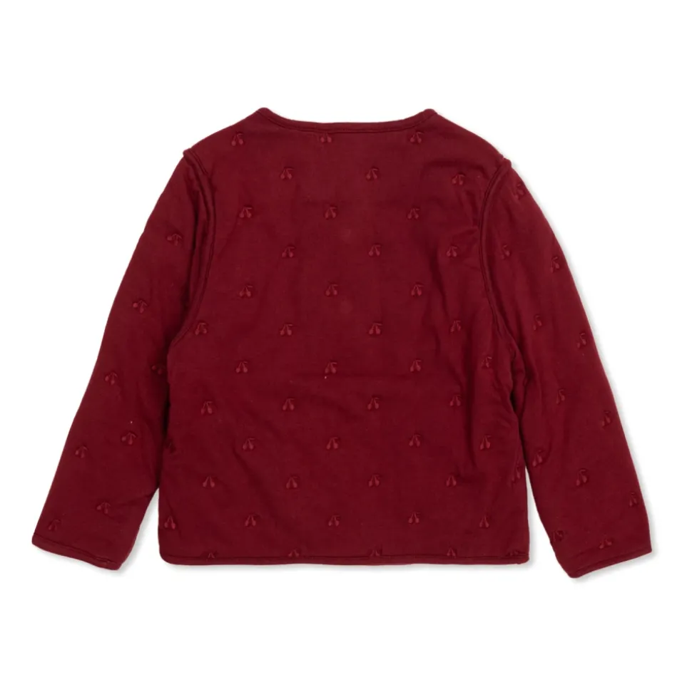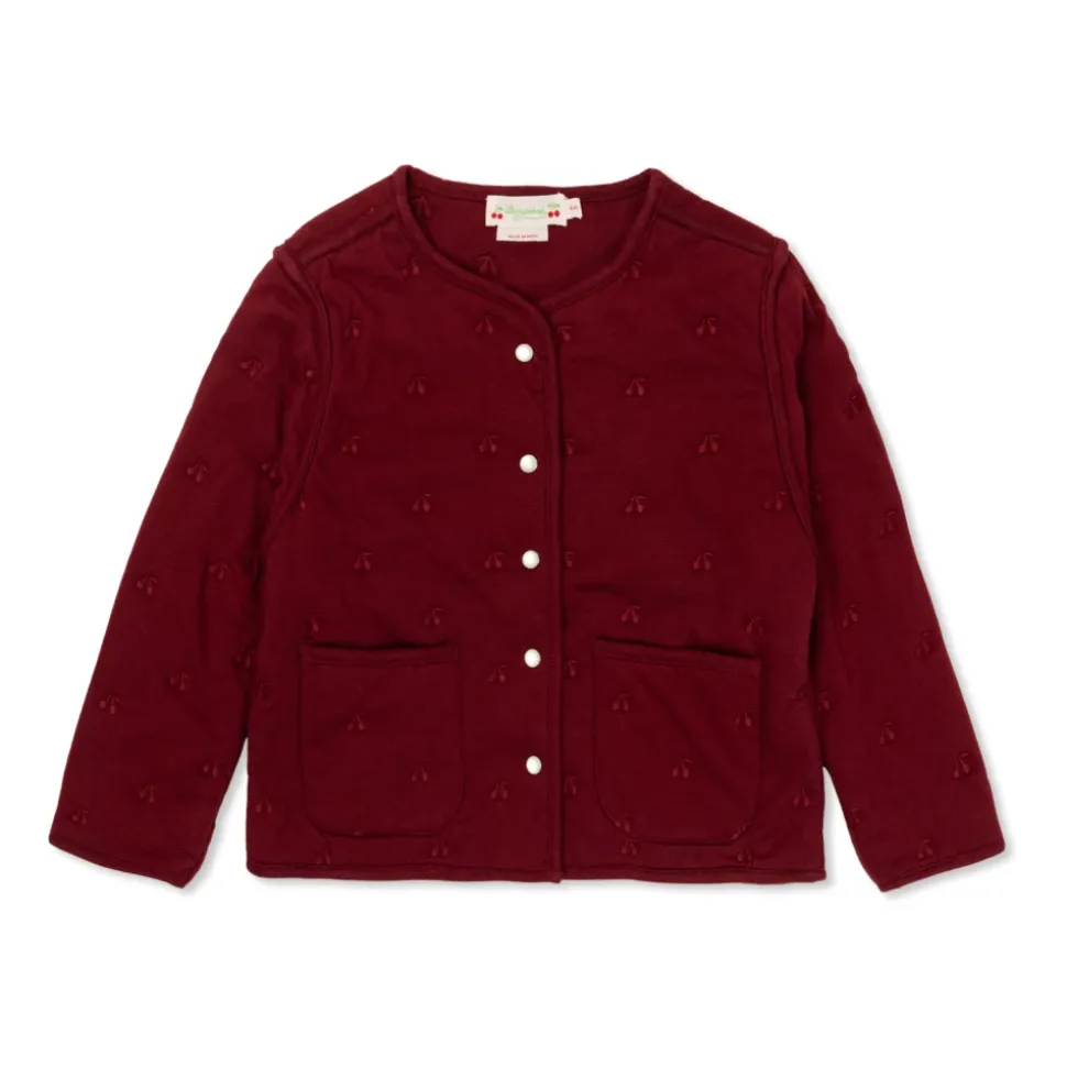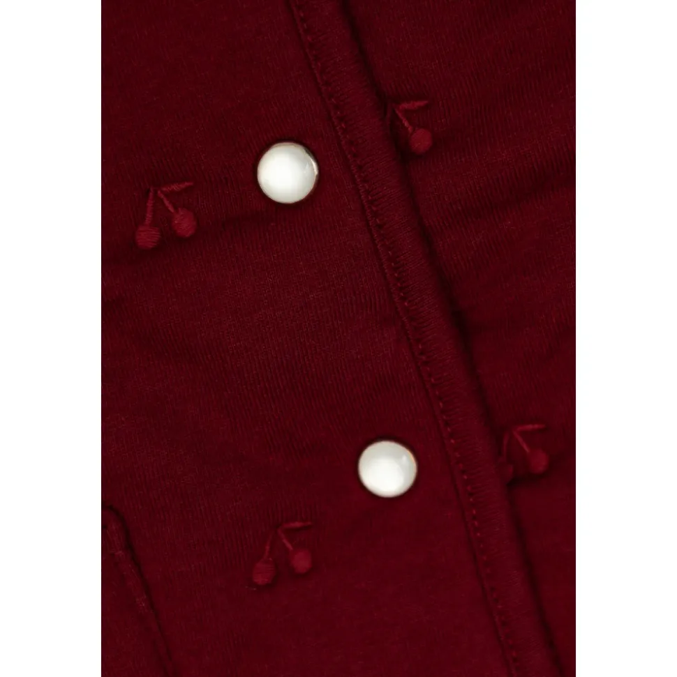 Bonpoint jas met geborduurd patroon combineert Parijse verfijning met een delicate driedimensionale kersenborduursel op een zachte katoenen tricot, ideaal voor koelere dagen en speciale gelegenheden. Belangrijkste kenmerken: Rood | Bordeau | Katoen | Drukknoopsluitingen met parelmoer | Twee opgestikte zakken aan de voorkant | Kraagloze, licht afgeronde halslijn | Lange mouwen | Driedimensionaal geborduurd kersenmotief | Rechte snit | Afmetingen & pasvorm: Klassieke rechte snit | Samenstelling & verzorging: Katoen
