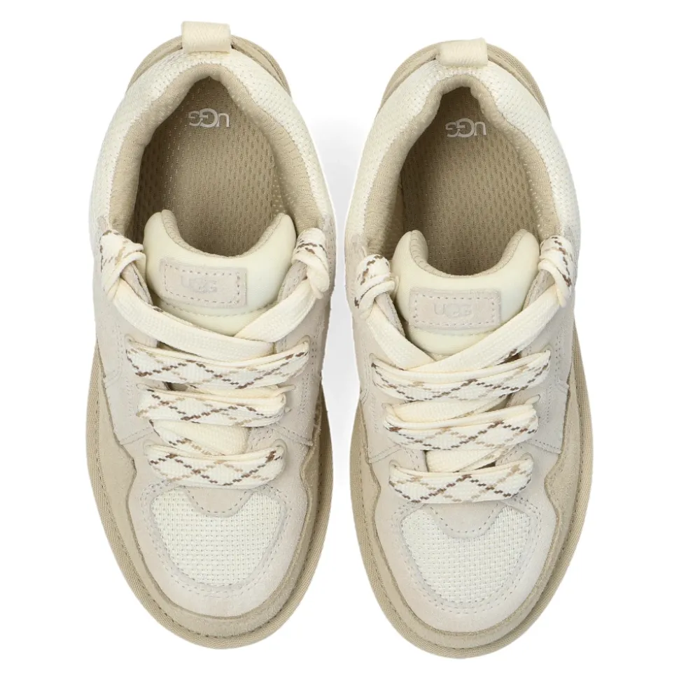 De UGG K Lo Lowmel Sneaker combineert een bovenwerk van getextureerd suède en mesh met een gedempte EVA-zool voor ademend, dagelijks comfort. Ontworpen voor een low-profile styling, combineert het praktische details zoals een webbing hielband en een dubbel vetersysteem. Belangrijkste kenmerken: Beige | Crème | Suède, Textiel | Ademend mesh bovenwerk | Lichtgewicht EVA-buitenzool | Gedempt comfort | Dubbel vetersysteem | Webbing hielband | Foam voetbed | Warmte-geperste logo details | Laag model silhouet | Afgeronde neus | Oversized gewatteerde tong | Tweekleurige platte veters | Afmetingen & pasvorm: Zoolhoogte op het hoogste punt: 2,5 cm | Samenstelling & onderhoud: Suède (bovenwerk) | Textiel / mesh (bovenwerk en voering) | Foam voetbed | EVA-buitenzool
