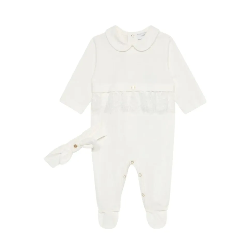 Kleed je kleintje in stijl met deze Roberto Cavalli katoenen romper en hoofdband set. Met een afgeronde kraag, kanten inzet en metallic RC Monogram details, is deze set zowel modieus als comfortabel. Perfect voor dagelijks gebruik of speciale gelegenheden.
