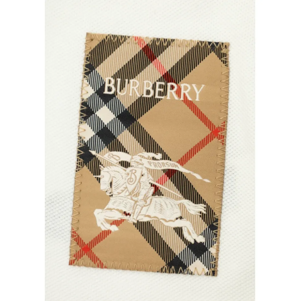 Introductie van de katoenen polo shirt met een logo patch van Burberry. Deze witte polo shirt heeft een klassiek kraagontwerp en een elegante knoopsluiting, wat zorgt voor een ongeëvenaard draagcomfort en een uitstekende pasvorm. Een opvallende patch in Burberry`s klassieke ruitpatroon, versierd met de “Burberry” letters en een grafisch ruiter motief, benadrukt het prestigieuze ontwerp. Belangrijkste kenmerken: Wit | Katoen | Klassieke kraag | Knoopsluiting | Logo patch met Burberry ruitpatroon | Afmetingen en pasvorm: Uitstekende pasvorm | Samenstelling en onderhoud: 100% Katoen | Machinewas koud, droogtrommel laag