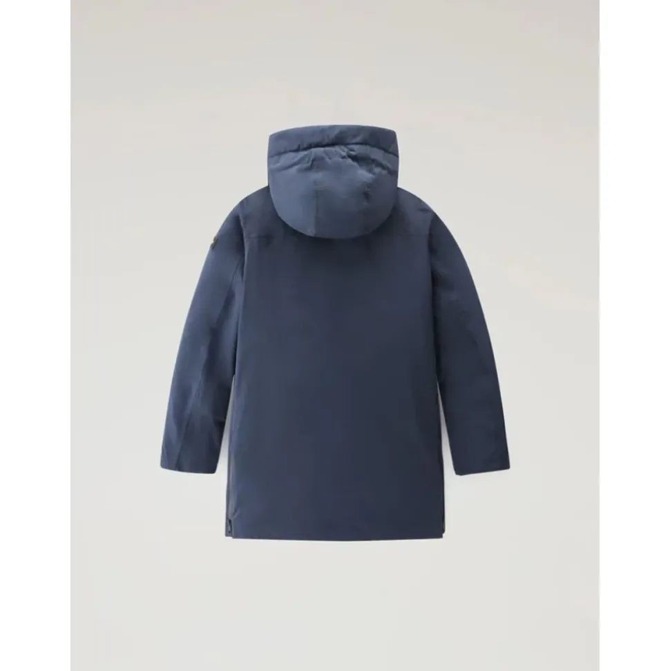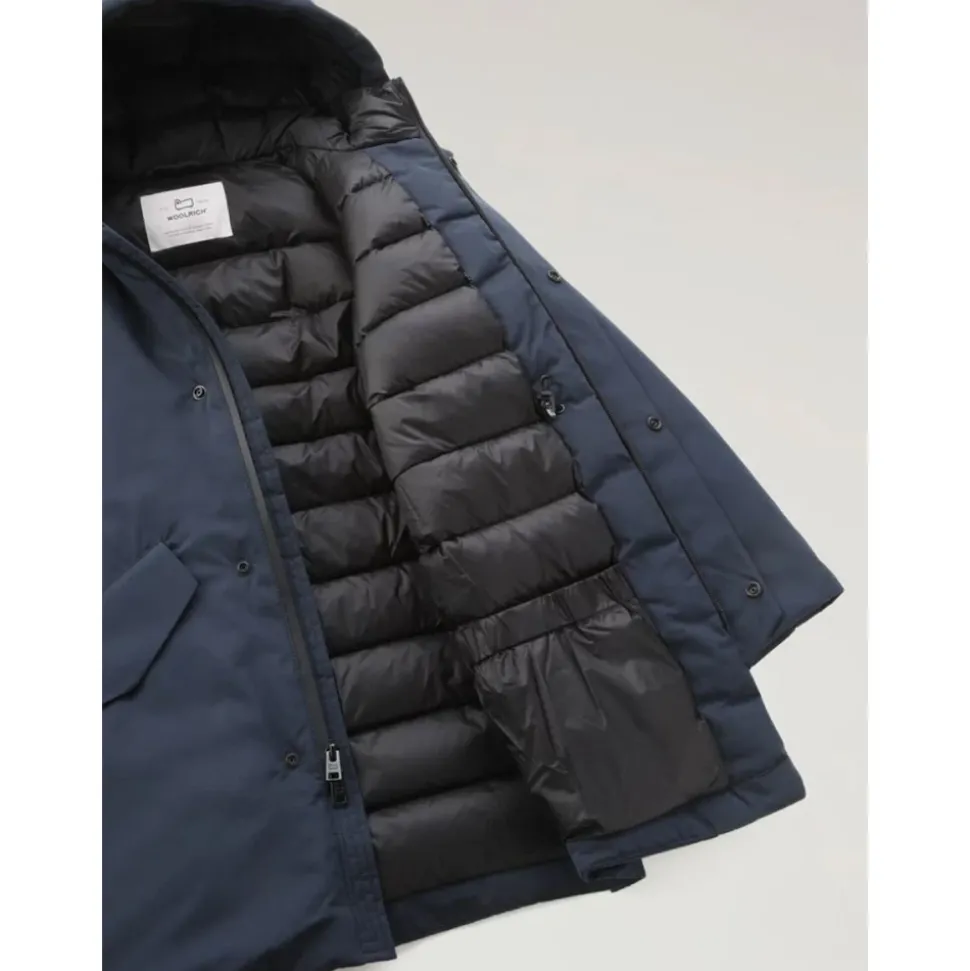Woolrich lange parka, gemaakt voor koude winterse omstandigheden, met donsisolatie en een hoge opstaande kraag met capuchon voor extra bescherming. Belangrijkste kenmerken: Blauw | Blu | Polyester | Geïsoleerd met donsvulling | Geschikt voor winterse klimaten | Bedekte centrale volledige ritssluiting | Borstzak met rits | Twee taille zakken met klep | Hoge opstaande kraag | Lange parka silhouet | Capuchon | Samenstelling & verzorging: 100% Polyester | 100% Polyamide | 90% Grijs eendendons, 10% Veer | Machinewas op 30°C; niet strijken; niet wassen met lichte kleuren; geen bleekmiddel gebruiken.