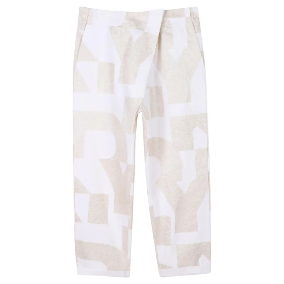 Upgrade de garderobe van je kleine meid met deze stijlvolle DKNY Kids crèmekleurige broek. Voorzien van een all-over gouden folie logo print, vier zakken, een normale taille met een off-center sluiting en een slim fit. Gemaakt van 85% katoen en 15% linnen.