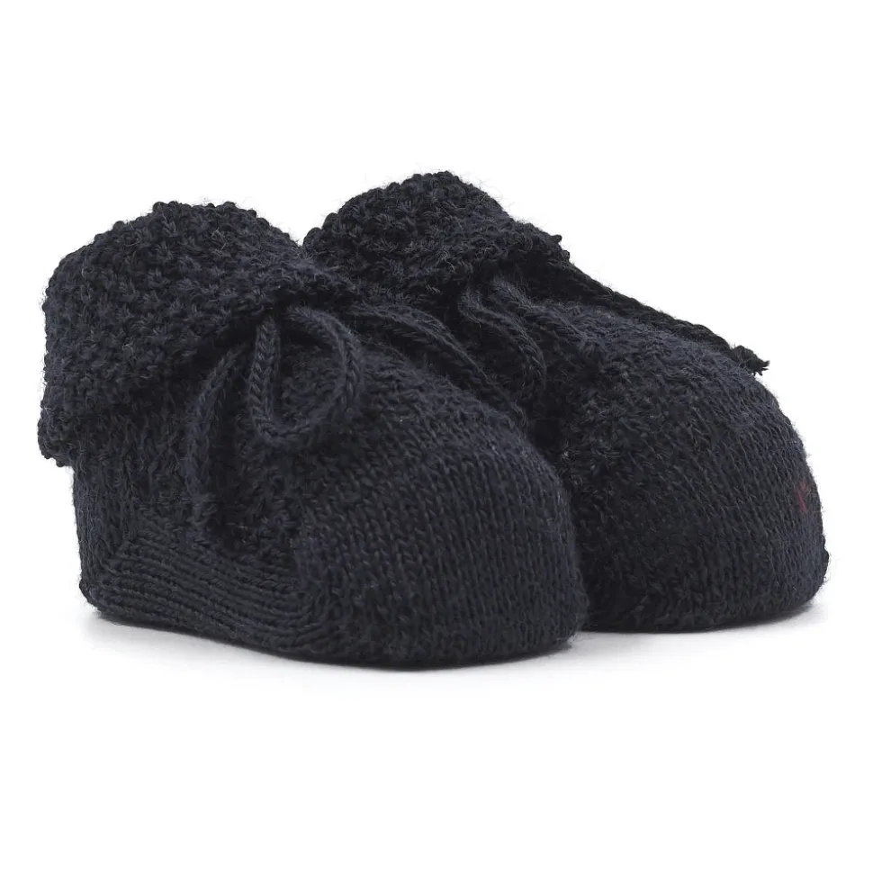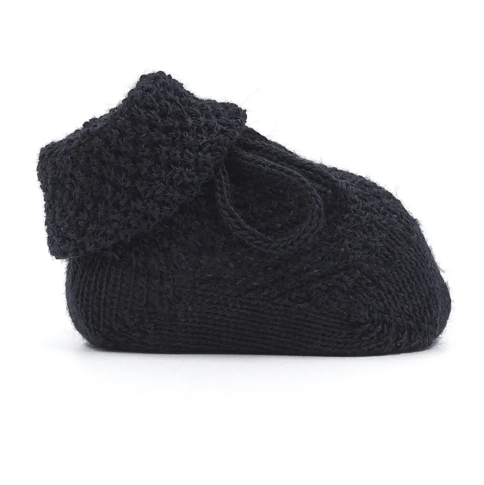 Kinderbootiesokken gemaakt in Italië van rijstgestikt katoenen stof met een blauwe satijnen strik in dezelfde kleur. Perfect voor die eerste paar maanden.
