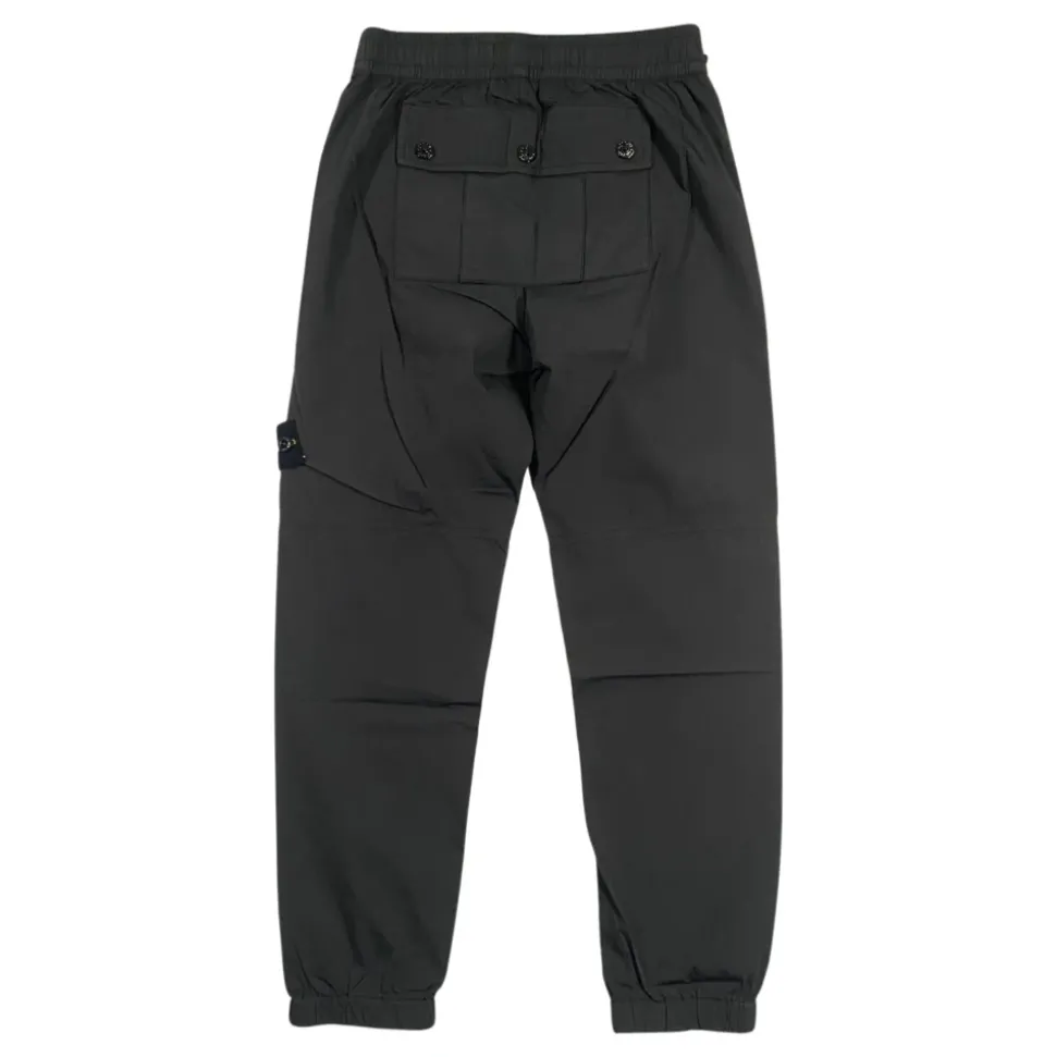 Stone Island Kids grijze katoenen en nylon broek met een elastische tailleband en interne trekkoord, twee zijzakken met rits, een grote centrale achterzak met drukknopen, elastische manchetten en een regular fit. Samenstelling: 74% katoen, 26% polyester. Gemaakt in Italië.