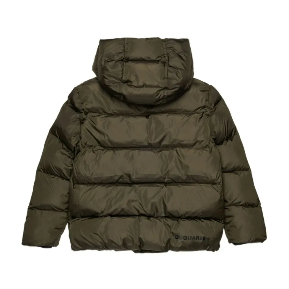 Blijf warm en stijlvol met deze olijfgroene DSQUARED2 KIDS Hooded Winterjas voor jongens. Voorzien van een verborgen ritssluiting aan de voorkant, ritszakken aan de voorkant, logo opdruk op de achterkant en lange mouwen. Gemaakt van 100% polyester.