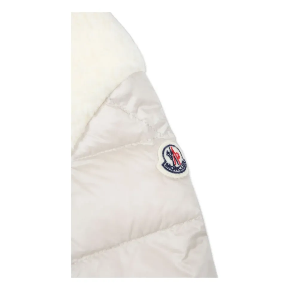 Blijf warm en stijlvol in deze Moncler winterjas voor meisjes. Met een lichtbeige katoenen gewatteerd ontwerp met applicatielogo, imitatiebont afwerking, nonchalante capuchon, ritssluiting aan de voorkant, lange mouwen, twee drukknoopsluitende zijzakken en donsveren vulling.